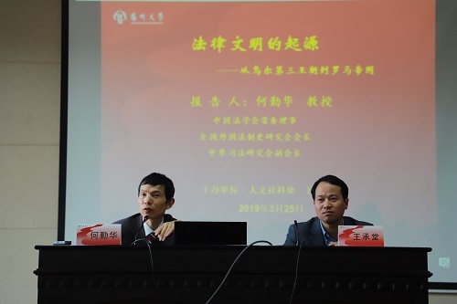 On the afternoon of March 25,2019,at the invitation of The Law School of Yangzhou University,professor He Qinhua from the Law School of East China University of Political Science and Law,delivered an academic report entitled"The Origin of Legal Civilization--from the Third Dynasty of Ur to the Roman Empire"in the moot court of our faculty.