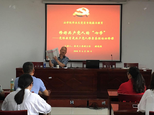 6月20日上午,我院在笃行楼三楼模拟法庭举办毕业生党员专题廉洁教育活动。校关工委副主任、校关工委理论宣讲组组长顾瑞漒应邀作题为《修好共产党人的‘心学’——党性教育是共产党人修身养性的必修课》的专题报告。学院党委副书记花瑞锋主持报告会,学院组织纪检员、团委(学工办)负责同志及全体毕业生党员近60人参加了相关活动。