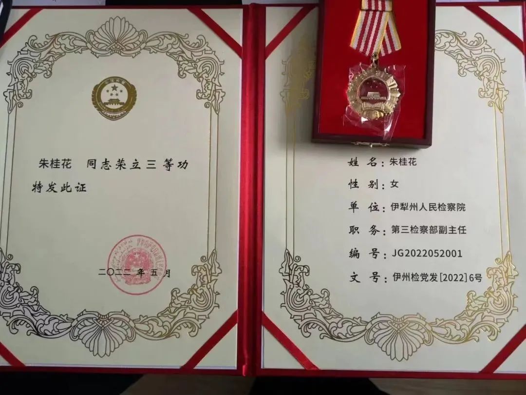 2021年,所在的伊犁州院经济犯罪办案团队获评自治区优秀办案团队,2022年3月被记集体二等功。她个人被伊犁州院荣记三等功。挂职期间,朱桂花同志经常牺牲休息时间,加班加点工作。为了办好在手案件,她还主动申请延长挂职时间一个多月。近年来,江宁区检察院紧紧围绕最高检相关要求和全省“一盘棋”支援战略,扎实做好对口援助工作,有力推动对口受援地区检察事业发展进步。