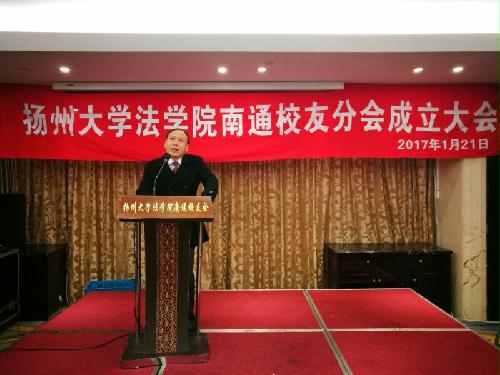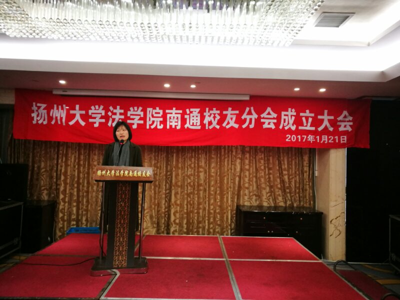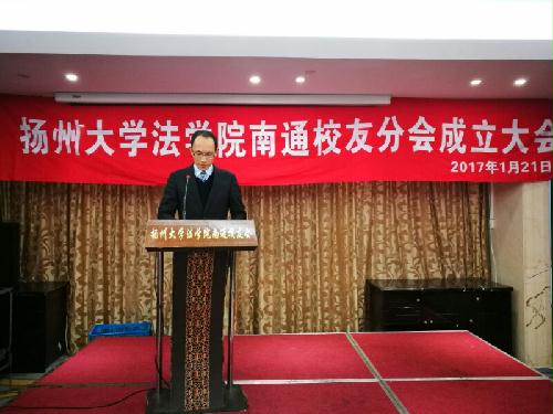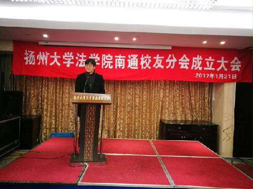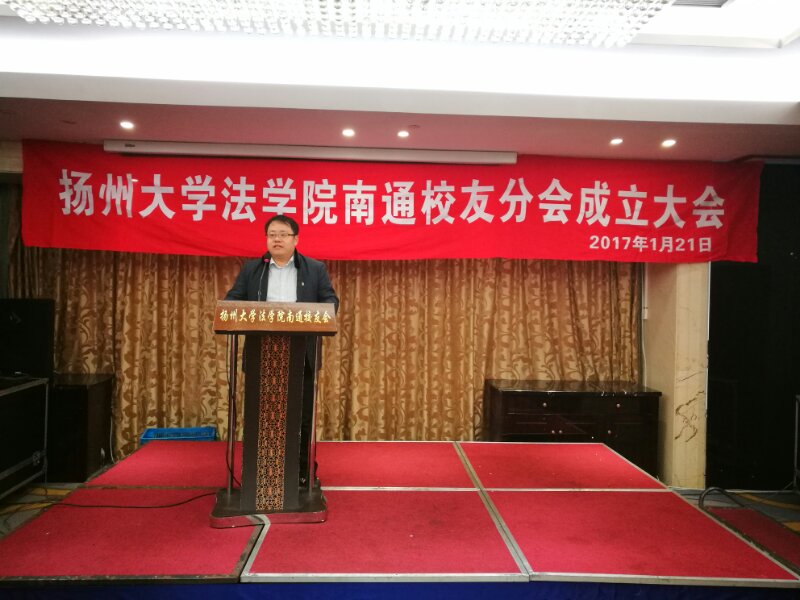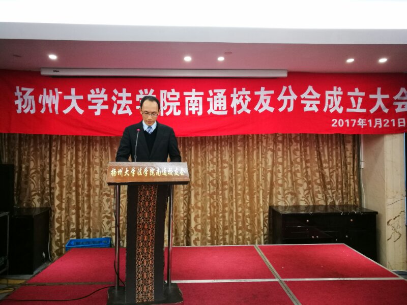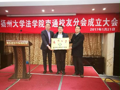 2017年1月21日,扬州大学法学院南通校友分会成立大会在南通隆重召开。校友总会秘书长王庆林、副秘书长王志健、校友工作部部长韦须祥,法学院党委书记孙鹏、院长王承堂、党委副书记花瑞锋、副院长李云波,法学院苏州校友分会副秘书长周伟,法学院教师代表以及来自南通地区的50多名法学院校友出席了成立大会。王庆林和王承堂共同为法学院南通校友分会授牌。成立大会由我院98级校友朱城主持。