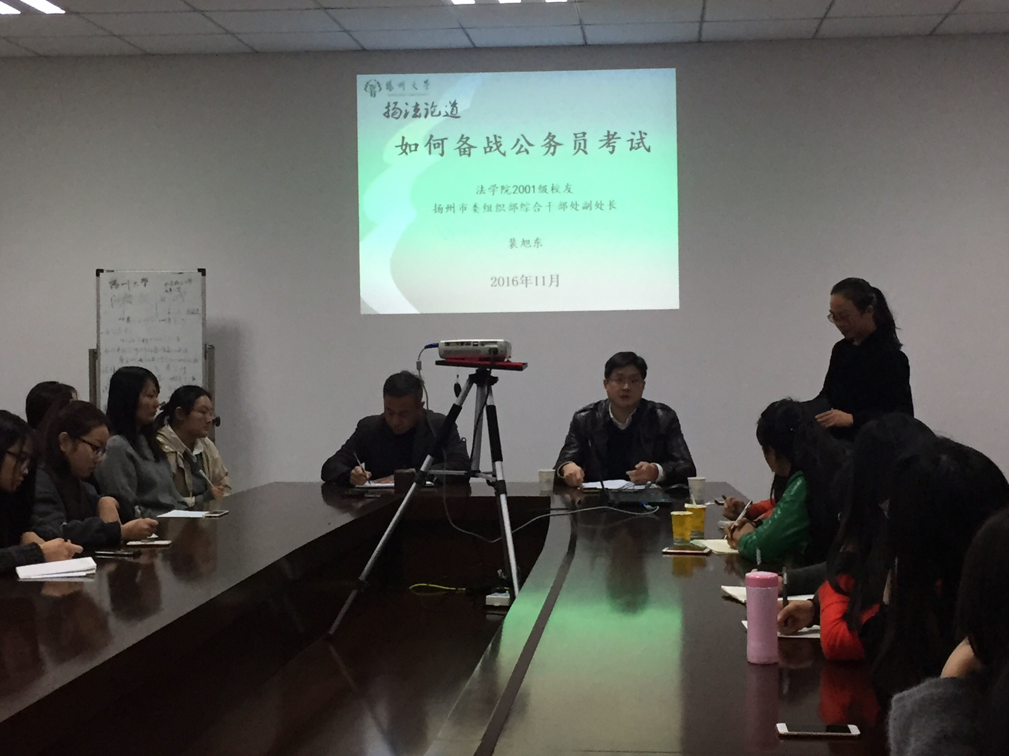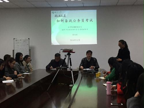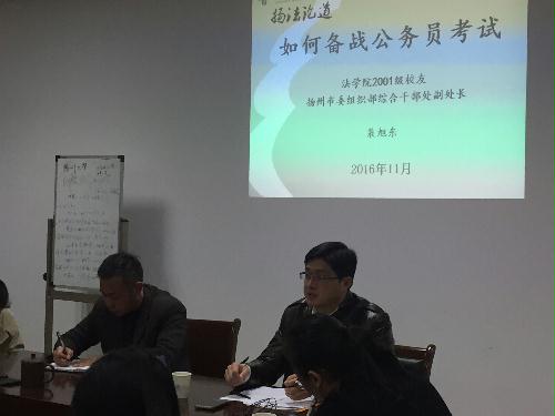 11月11日下午4:30,我院2001级校友,扬州市委组织部综合干部处副处长裴旭东应我院的邀请在笃行楼三楼学院会议室为正在紧张备战公务员考试的毕业生做了题为“如何备战公务员考试”的专题辅导讲座,讲座由院党委副书记花瑞锋主持。