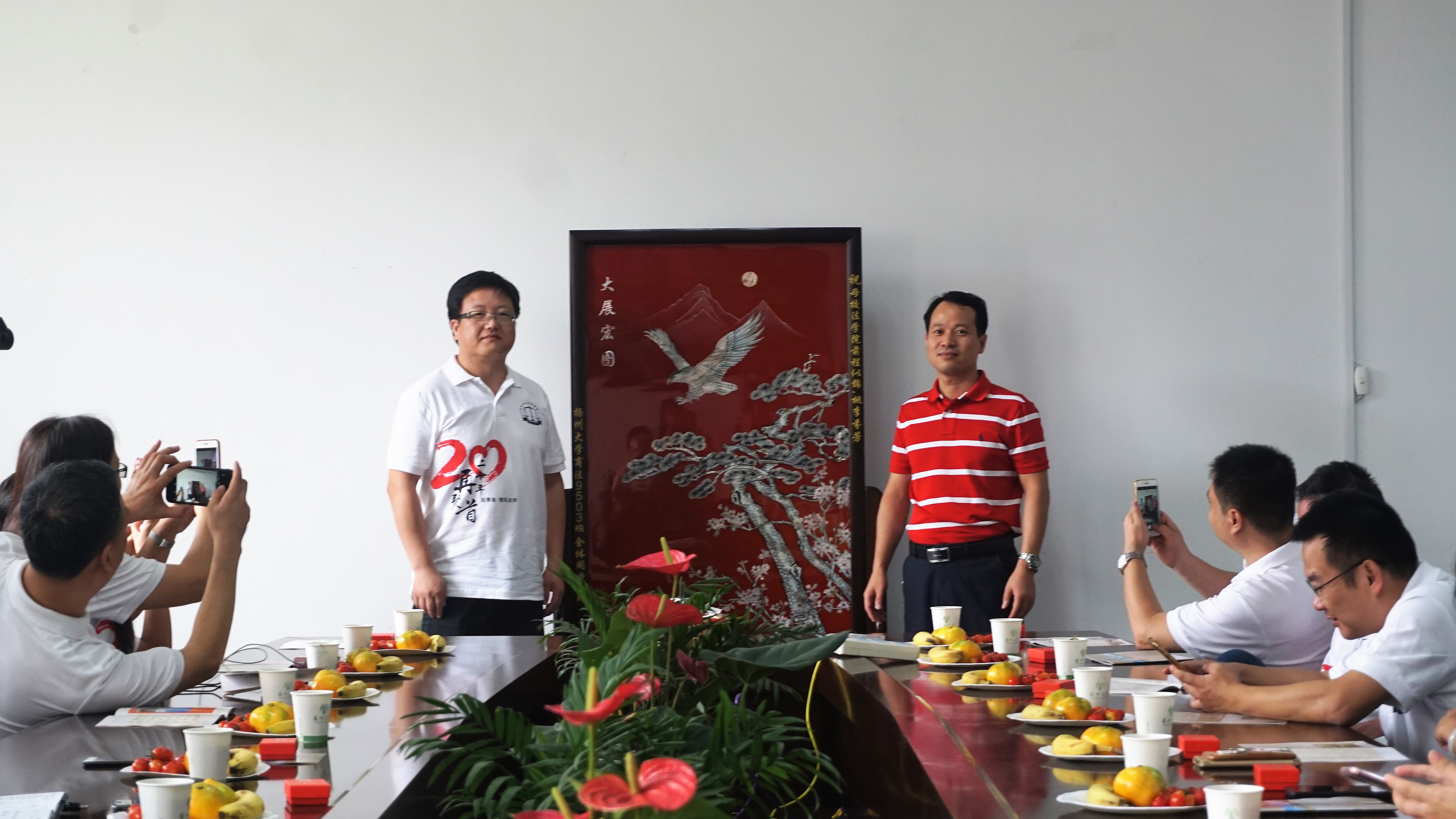 9月16日上午,院长王承堂、院党委副书记花瑞锋与返校校友在学院会议室举行师生茶话会。会上,王院长向返校聚会的校友们表示祝贺和诚挚的欢迎,同时介绍了学院近年来发展的情况。校友们逐个发言,回忆青春岁月、同窗情谊。校友们纷纷慨叹二十年荏苒,为表达对母校和老师们的感激之情,同时祝愿学院发展越来越好,特向学院赠送了“大展宏图”落地漆器屏风。