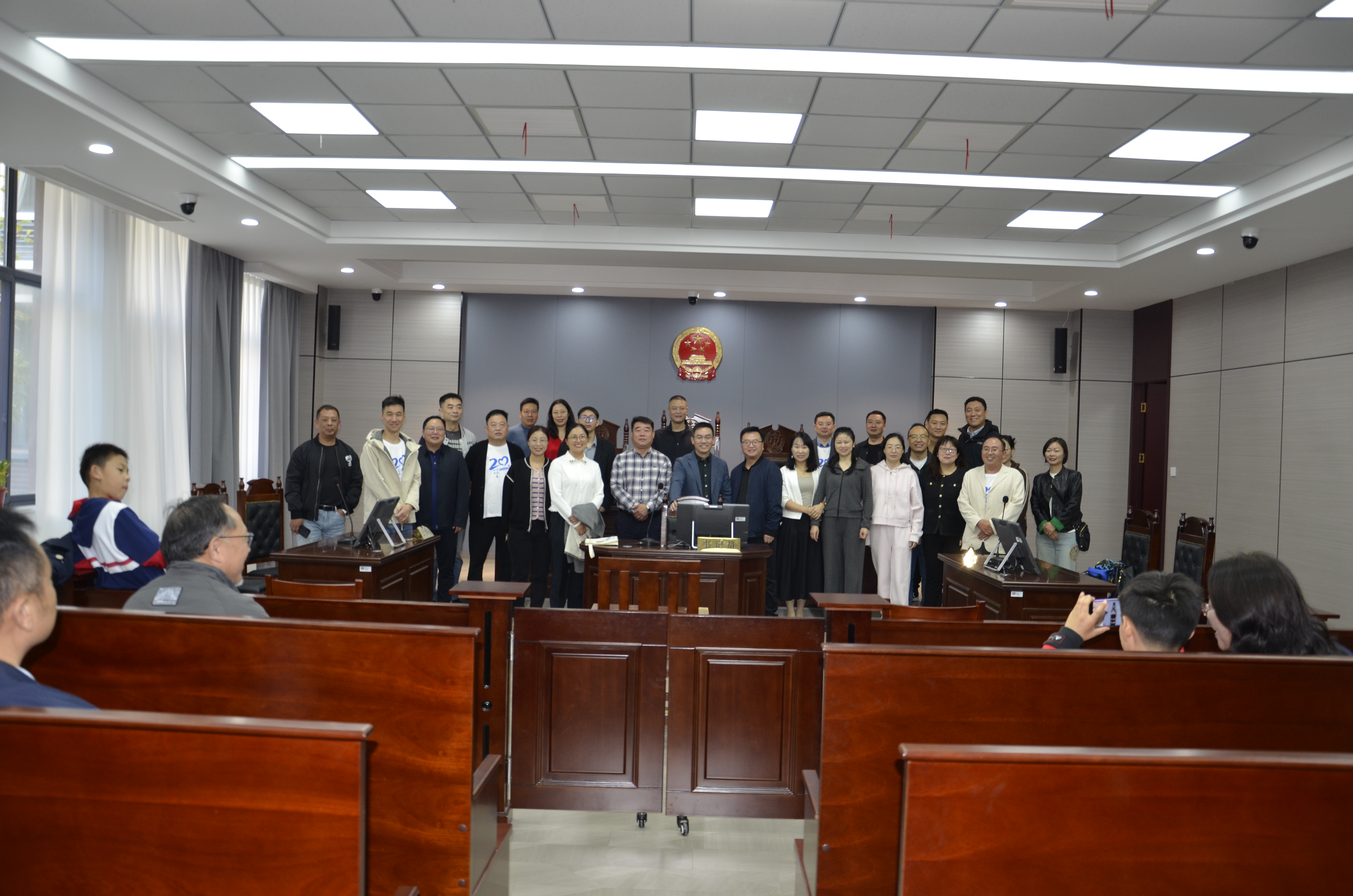 校友们在参观了法学院文化长廊、智慧模拟法庭等场所后合影留念。