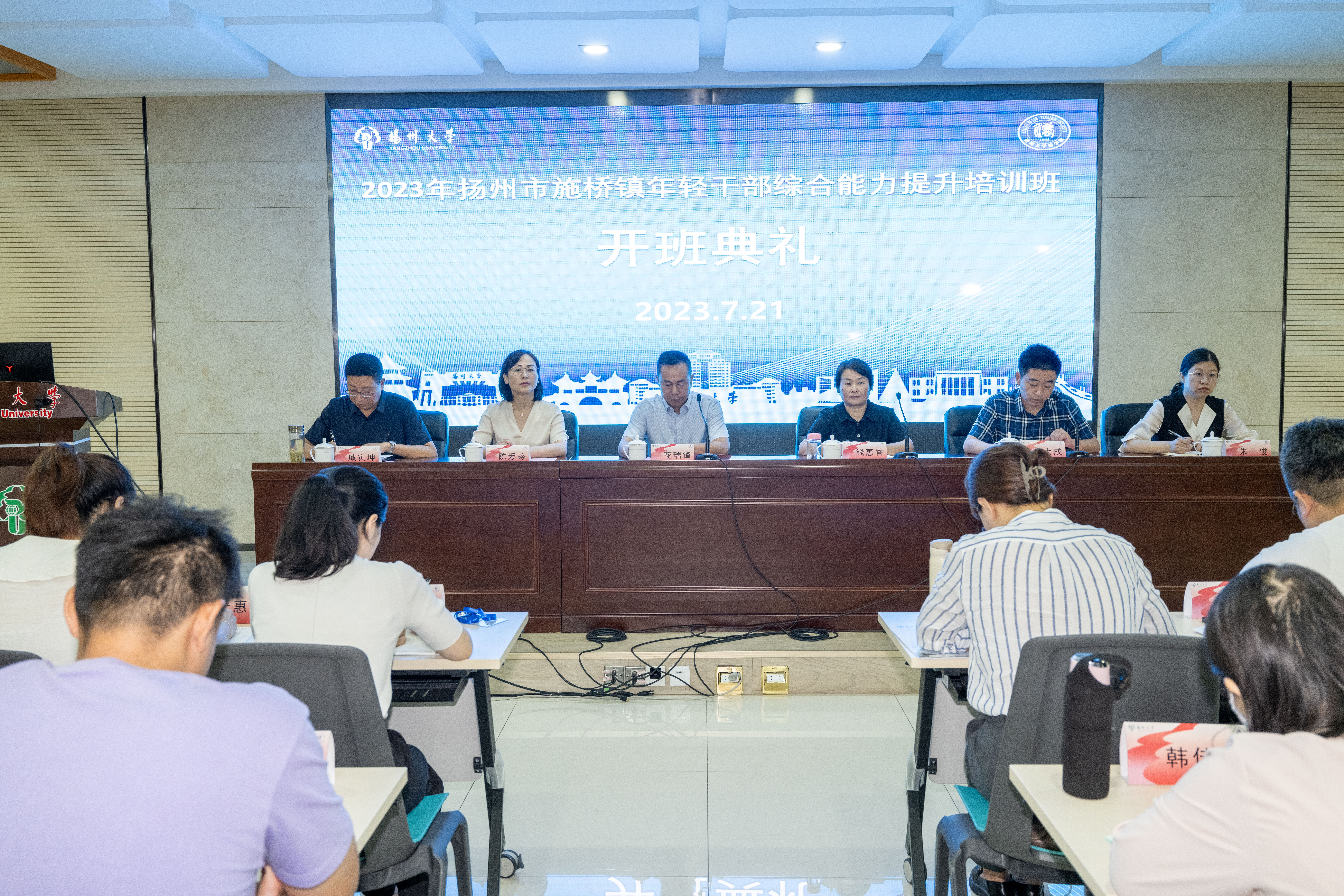 7月21日上午,扬州市施桥镇年轻干部综合能力提升培训班在我院顺利开班,法学院党委书记花瑞锋,副院长陈爱玲,施桥镇党委书记钱惠香,党委副书记、镇长卞大成,党委副书记、政法委员戚寅坤,党委组织委员朱俊以及施桥镇101名年轻干部出席了开班仪式。开班仪式由施桥镇党委副书记、镇长卞大成主持。
