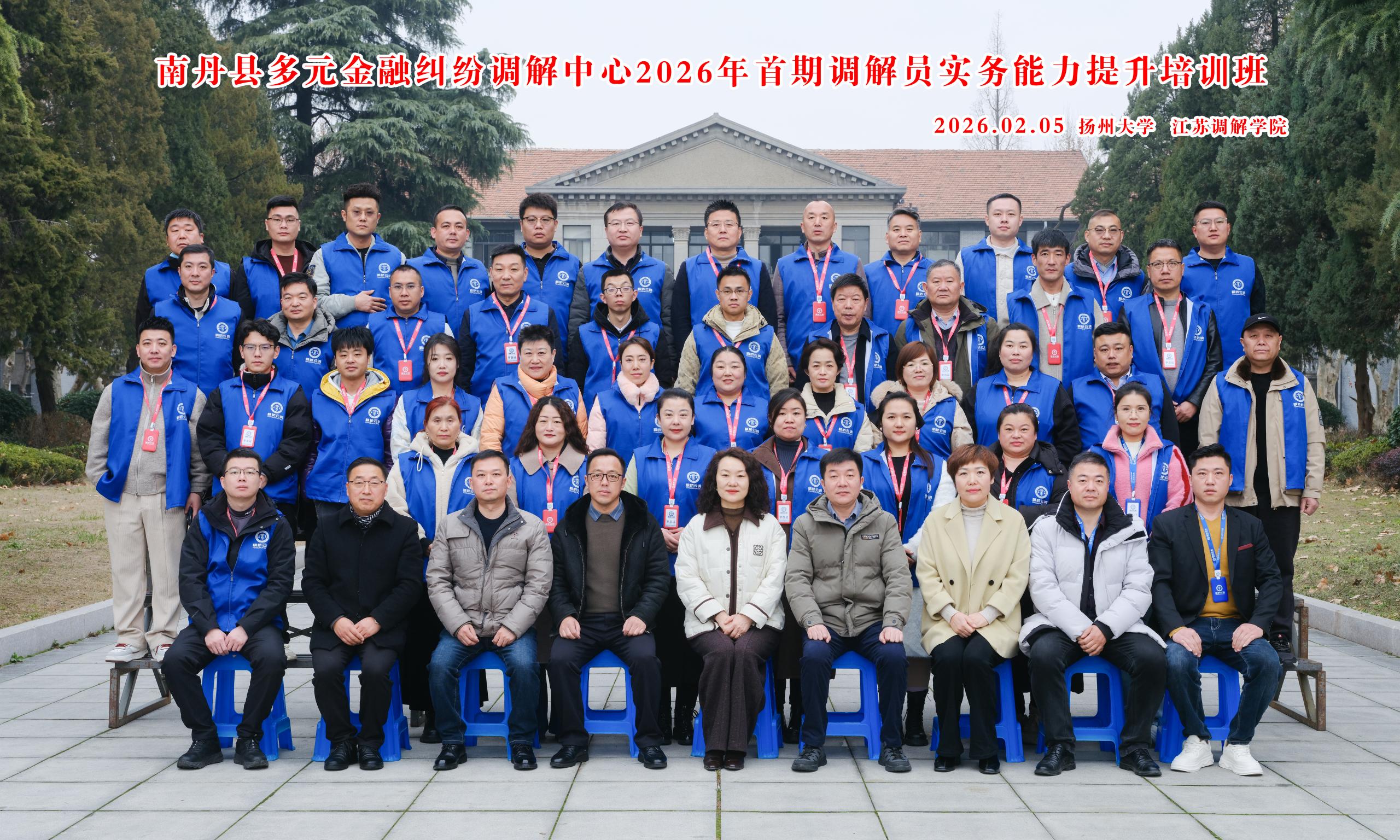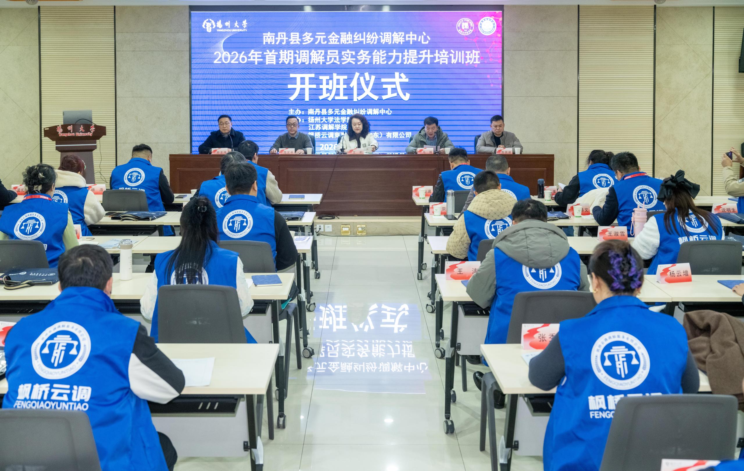 2月5日,南丹县多元金融纠纷调解中心2026年首期调解员实务能力提升培训班在扬州大学瘦西湖校区正式开班。本次培训由南丹县多元金融纠纷调解中心主办,扬州大学法学院、江苏调解学院承办,枫桥云调商事服务(广东)有限公司协办。扬州大学继续教育学院副院长王莉、法学院副院长马辉、中科产业研究院枫桥云调主任范文书、南丹县多元金融纠纷调解中心主任苏奕波出席开班仪式,来自山东、江苏、广东等地的40余名调解员齐聚一堂,开启为期两天的集中研修之旅。