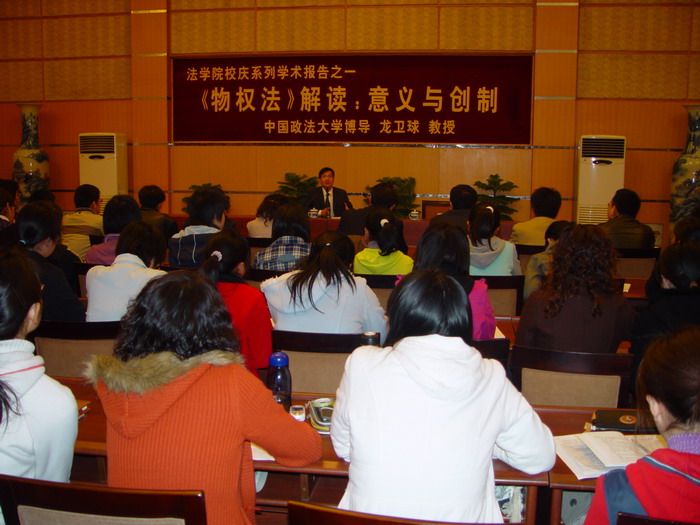 4月5日下午,中国政法大学博士生导师龙卫球教授来到法学院,作了题为《〈物权法〉解读:意义和创制》的学术报告。法学院焦富民院长主持报告会,法学院全体师生及兄弟学院的部分同学听取了讲座。龙教授首先向同学们介绍《物权法》制定过程中产生的争论。他把这场争论分为外部争论和内部争论。接着,龙教授就《物权法》总结了11条具有进步意义的创制点。龙教授认为,《物权法》的出台意义十分重大,它使中国的法律进程跨出了重要的一步,给中国的民法观念带来了一些新的思潮,同时也促进了整个法学专业的发展。整个报告会气氛热烈、高潮迭起,最后,报告会在热烈的掌声中落下帷幕。这次学术报告是法学院校庆系列学术报告的第一场学术报告。据法学院焦富民院长介绍,在今后一个月内,将会有全国高校的知名法学专家陆续来到法学院作报告。