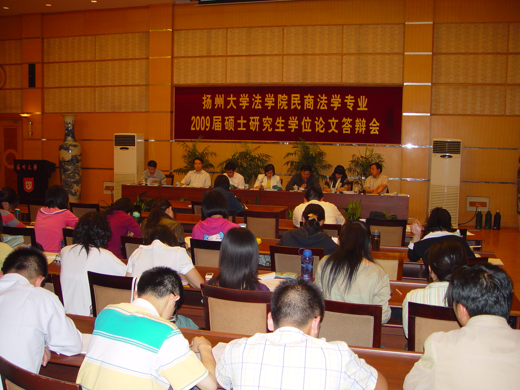 2009年5月25日下午,法学院2009届硕士研究生学位论文答辩会在荷花池校区中心主楼二楼多功能厅举行。此次答辩邀请到南京大学法学院金俭教授作为答辩委员会主席,我院今年毕业的民商法专业5位研究生孙春雷、唐梨芳、王妍、杨欣和姚华按照相关流程分别作了介绍和答辩。会后,金俭教授还作了一场题为《住宅权保障与政府责任》的学术报告。