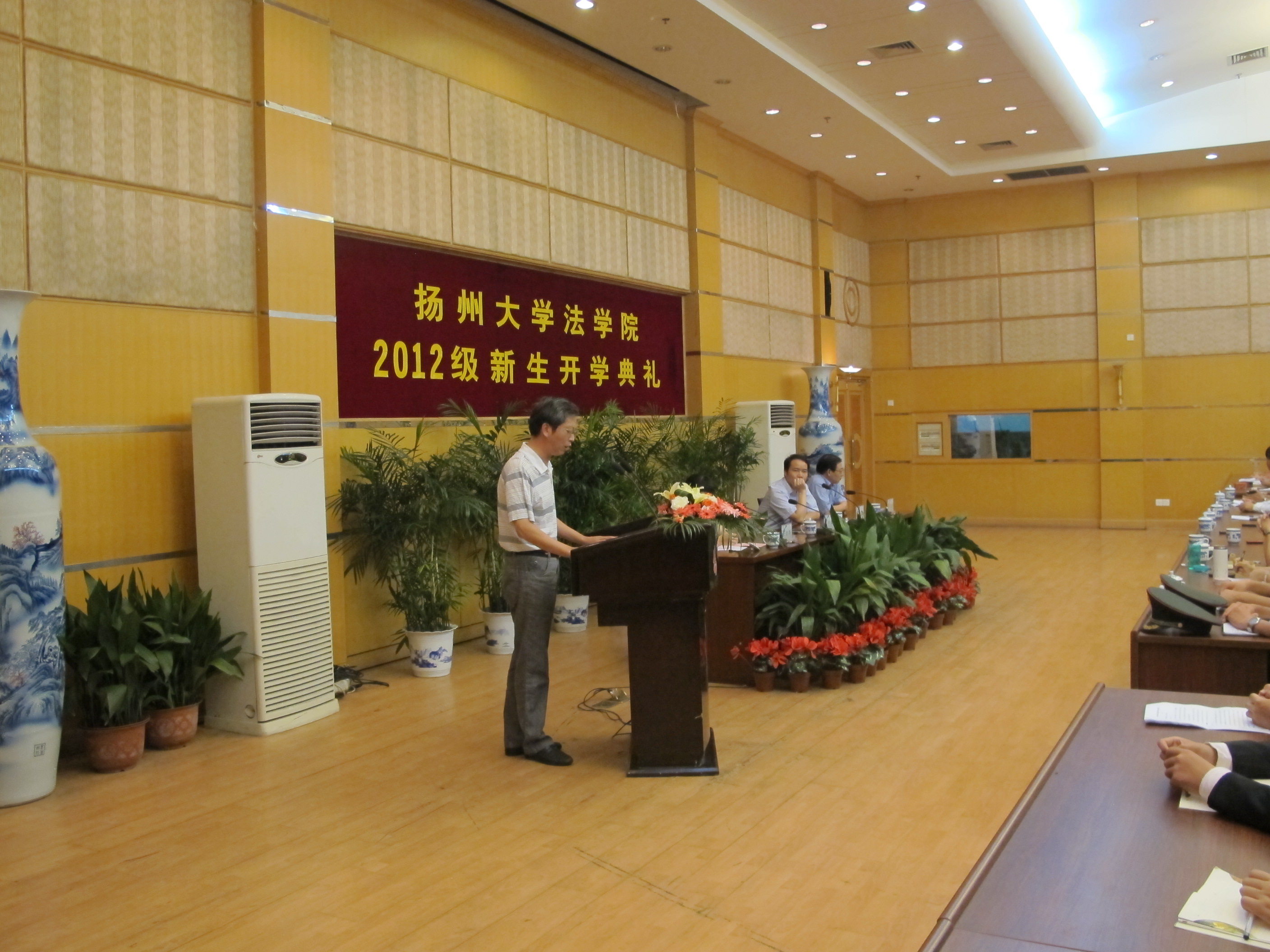 9月11日下午2点半,法学院2012级新生开学典礼在主楼多功能厅隆重举行。法学院党委书记卢彪老师、党委副书记洪岑老师、副院长钱玉林教授、胡吕银教授以及法学院各教研部主任、新生班级班主任、教师代表和2012级全体新生一起参加了开学典礼。