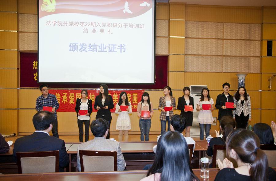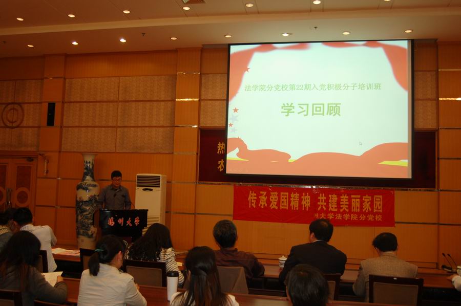 在院分党校本期培训班中,全体学员结合讲座和实践,围绕反腐倡廉,端正入党动机,理性爱国以及如何塑造和体现青年大学生的社会责任感等展开了热烈的分组讨论和大班交流,并对院分党校应当如何进一步在培养、塑造合格法律人才工作中发挥作用提出了自己的建议。培训班第四组学员代表、11法二班周雯晴同学的主题发言《奋进在党旗下》阐述了学员们的思考和信念。