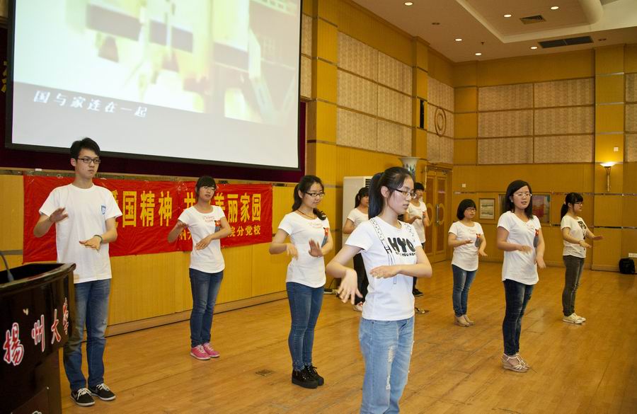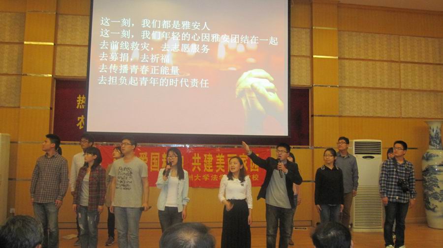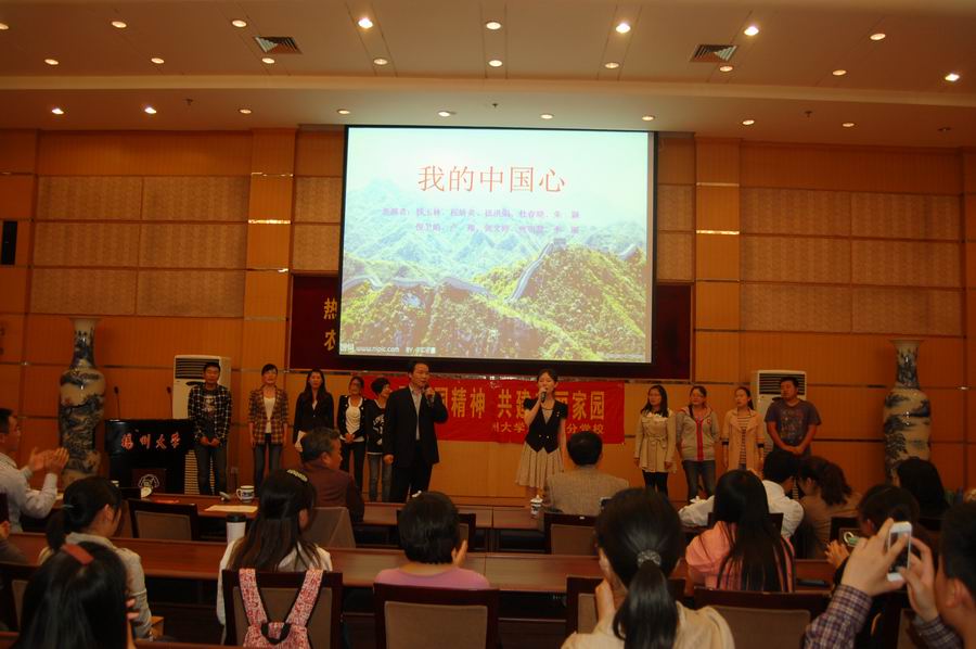 手语舞《国家》、歌曲与诗朗诵《我爱你,中国》抒发了学生们对祖国的热爱;诗朗诵《青春中国梦》表达了青年学子们心系祖国,勇担时代重任的壮志豪情;歌曲《相亲相爱》和特别的“祝福雅安”视频凝聚了全院师生的良好心愿。