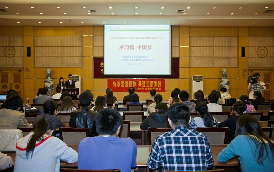 为学习贯彻习总书记五四重要讲话精神,5月16日晚七点,法学院党委、分党校在荷花池校区主楼二楼多功能厅隆重举行“家园情·中国梦”主题教育活动。校党委宣传部部长薛小平,扬州大学老干部艺术团团长谈锦封,法学院党委书记钱玉林、党委副书记洪岑、副院长陈承堂以及全体班主任、党支部书记和支委,院分党校第二十二期入党积极分子培训班全体学员和学生党员代表等参加了本次主题教育活动。活动共分三个篇章。