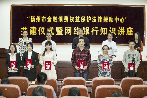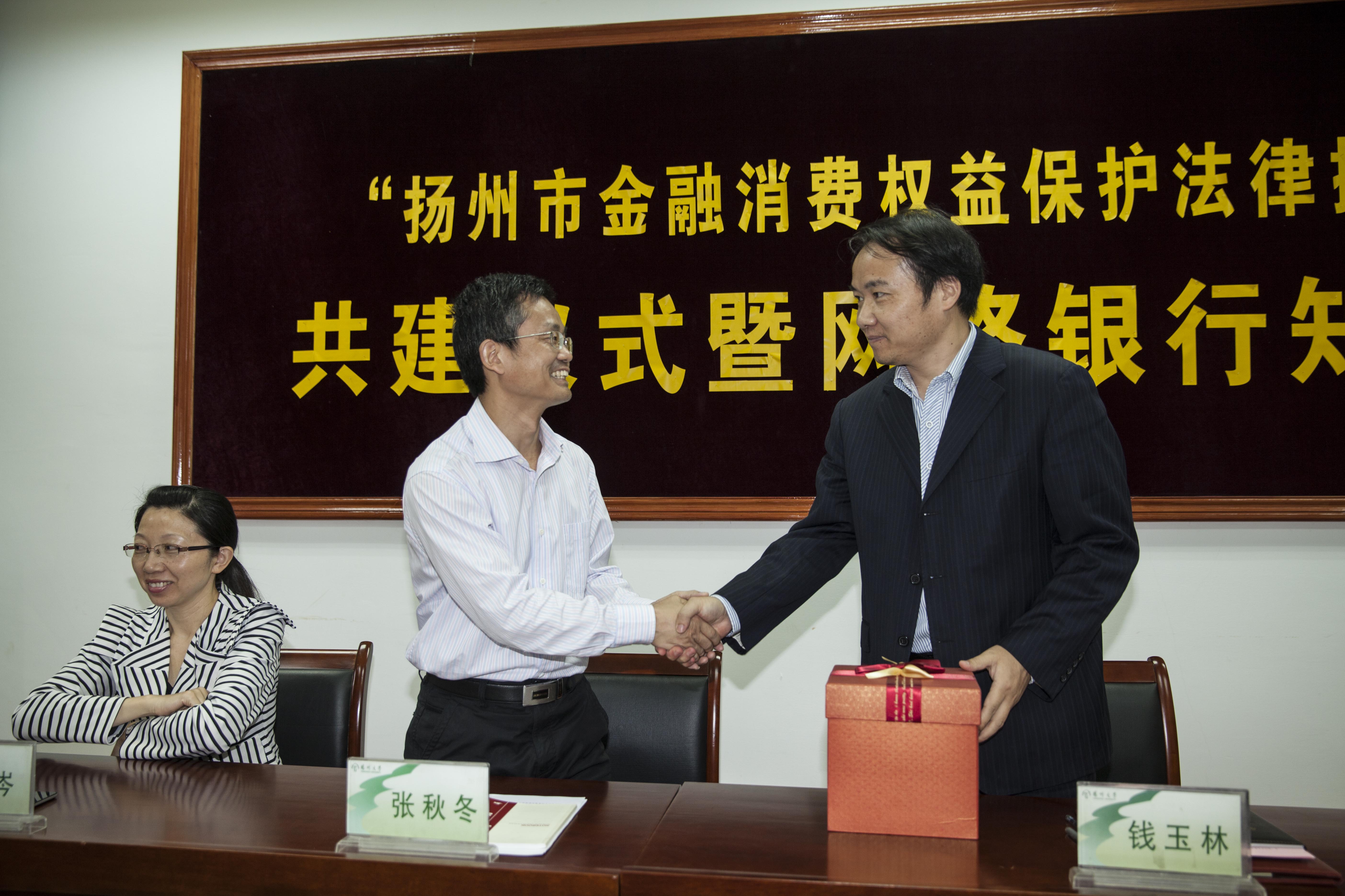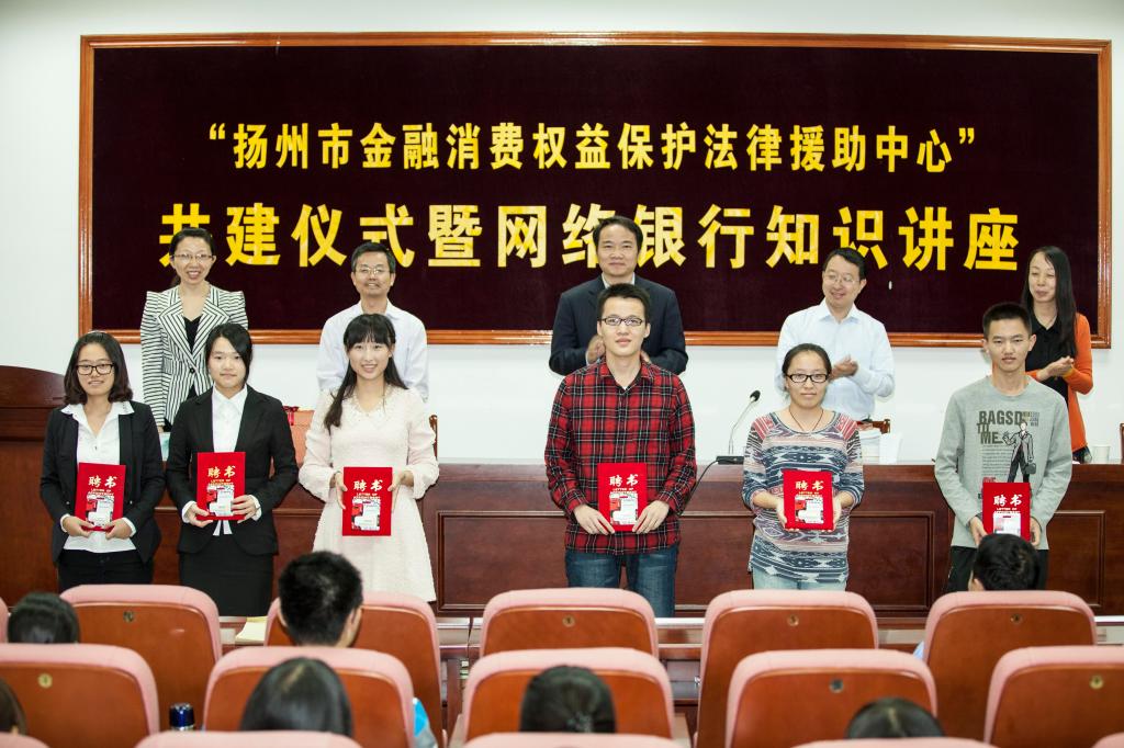 活动中,中国人民银行南京分行法律事务处周晓刚副处长与扬州大学法学院党委副书记洪岑一同为新成立的“金融消费保护法律援助中心”揭牌,中国人民银行扬州市中心支行党委委员张秋冬副行长与法学院院长签订合作协议,宣布“扬州市金融消费权益保护法律援助中心”正式成立。本次共建活动中,共建双方还聘请了法学院陈承堂、孟咸美老师作为中心的法律顾问,另外法学院学生朱丽雅、宋丽和刘巍等同学也被聘为金融知识宣传员。