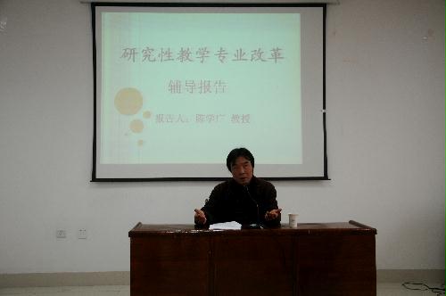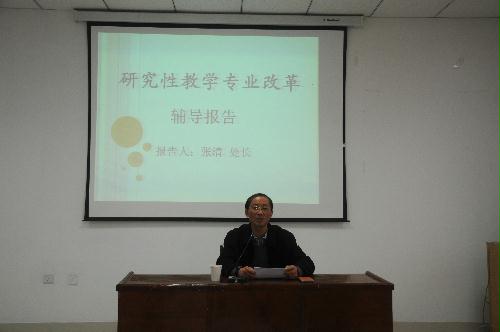 张清教授从学校层面对研究性教学专业改革提出了要求:陈学广教授在辅导报告中首先强调,教授举行研究性教学公开课不是向学生发布自己的研究心得,而是要探究知识的形成过程,如果没有将学生充分调动起来就是失败;同时要改变教师传统单一的讲授方式,教师的作用只是一个引导者,应充分采用讨论式、启发式、探究式以及案例式教学。