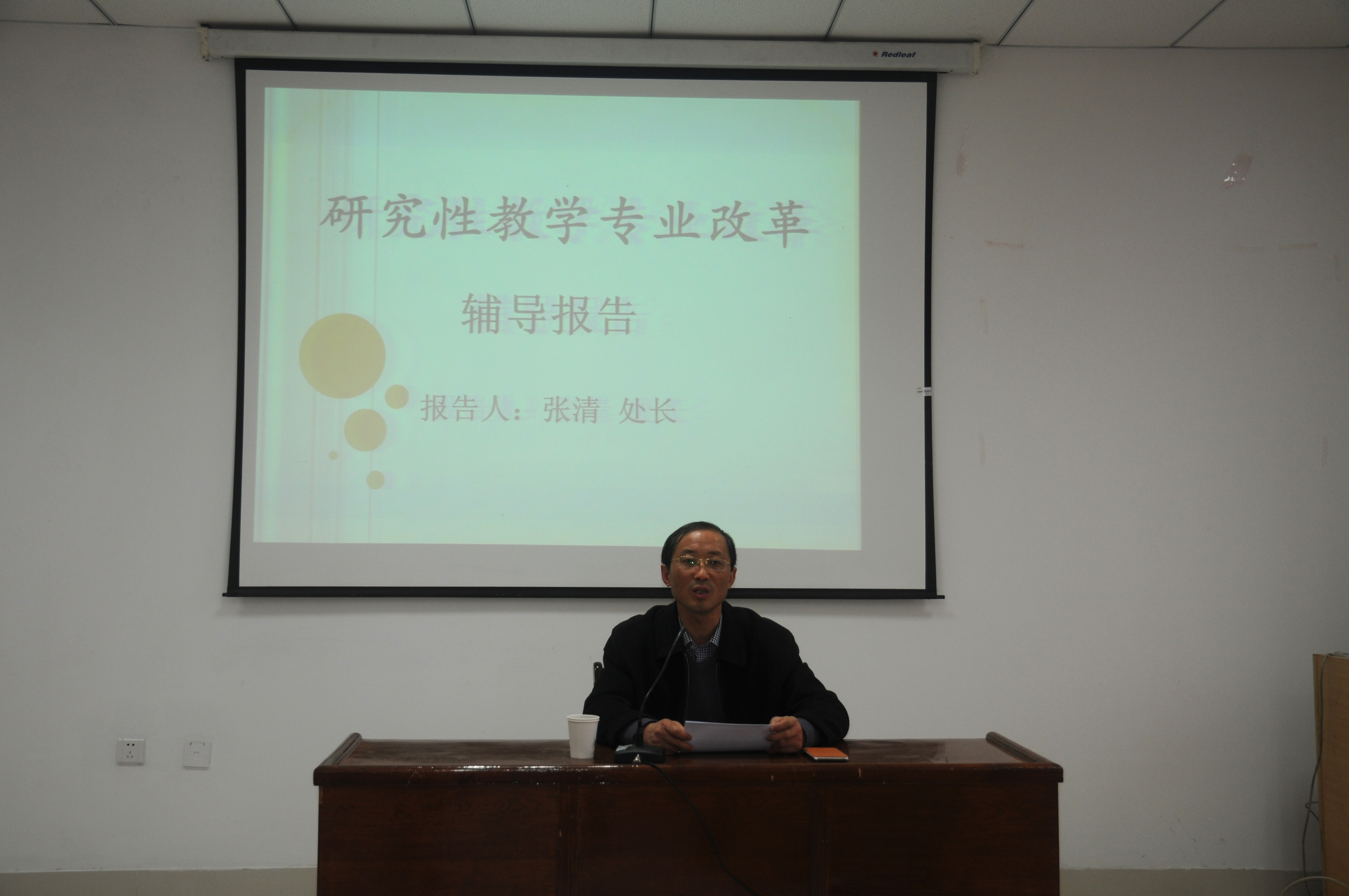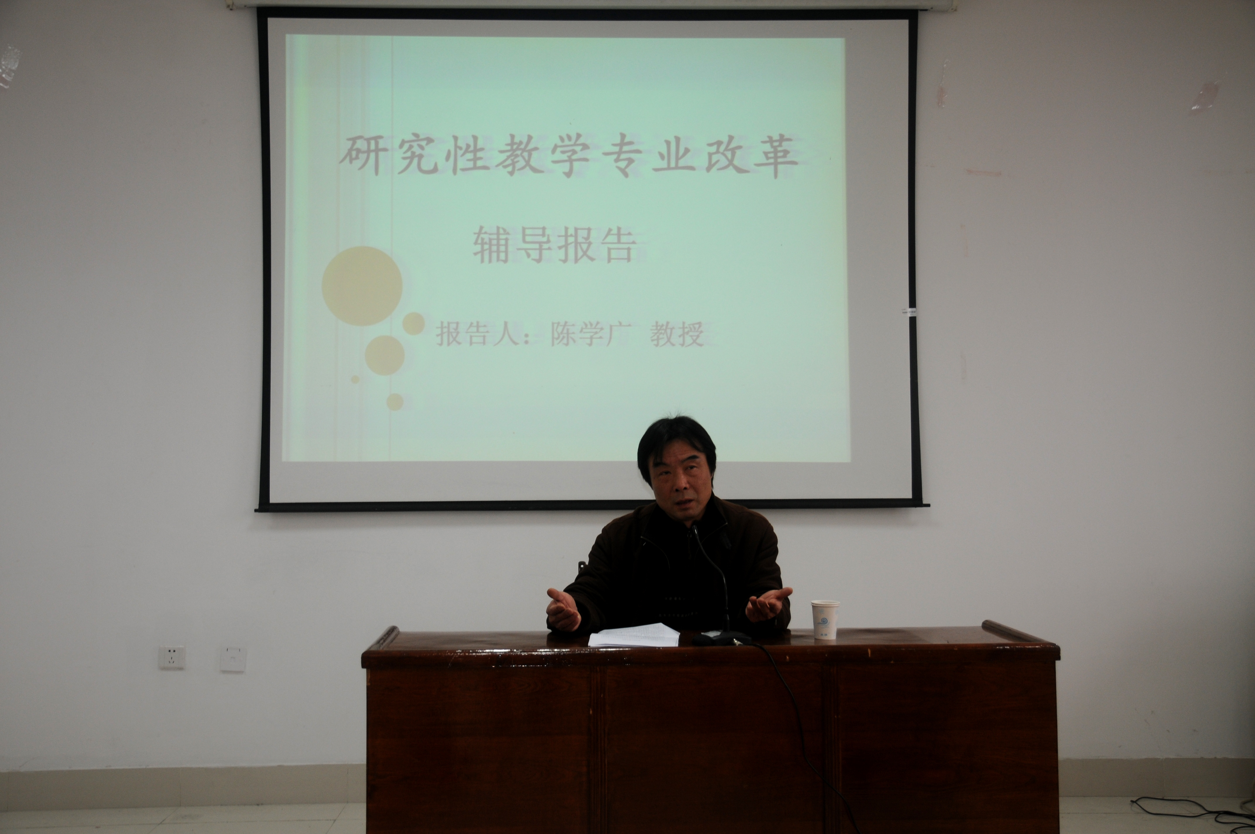 2014年3月19日下午我院邀请教务处长张清教授和文学院副院长陈学广教授作研究性教学专业改革的辅导报告。报告由陈承堂副院长主持,学院全体教师参加。