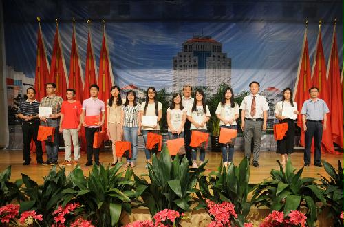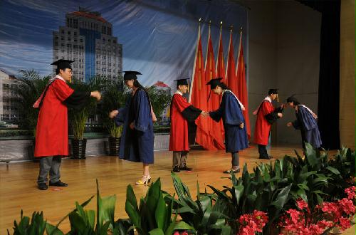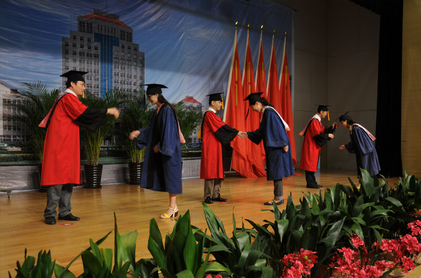 下午2点,毕业典礼在庄严的国歌中正式开始。院党委副书记洪岑依次宣读了毕业生名单、优秀毕业生表彰决定以及本届毕业生校友会理事与校友联络员名单,并和其他院领导共同颁发了毕业证书、优秀毕业生证书、校友会理事与校友联络员证书以及漆器赠品。