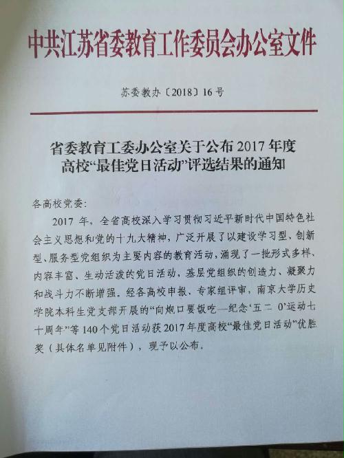 据悉,全省高校共有140个党日活动荣获2017年度“最佳党日活动”优胜奖,其中,我校共有两项。