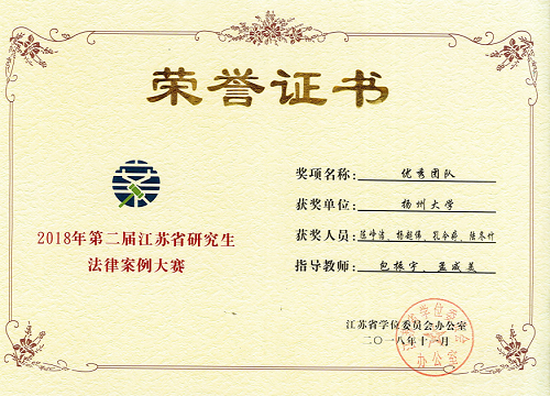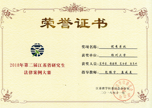 据悉,本次大赛分为书状竞赛和庭辩竞赛两部分,书状竞赛由24名评委匿名评审,对成绩前6名的代表队给予奖励;庭辩由初赛、复赛、决赛组成,评委当场评议并宣布结果。来自南京师范大学、苏州大学、东南大学等15家高校组队参赛。扬州大学代表队由我院包振宇、孟咸美两位老师担任指导教师,我院陈峥洁、杨超伟、孔令婷、陆冬竹四名研究生组成。