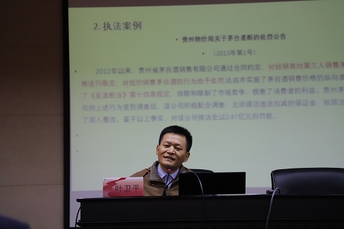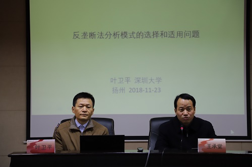 2018年11月23日上午,应扬州大学法学院邀请,中国经济法学研究会理事、广东省法学会经济法学研究会常务理事、广东省法学会医药食品法研究会副会长、深圳大学规制与公共政策研究中心副主任、法学博士叶卫平教授莅临我院,在笃行楼二楼模拟法庭作了题为“反垄断法分析模式的选择和适用问题”的学术报告。