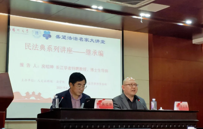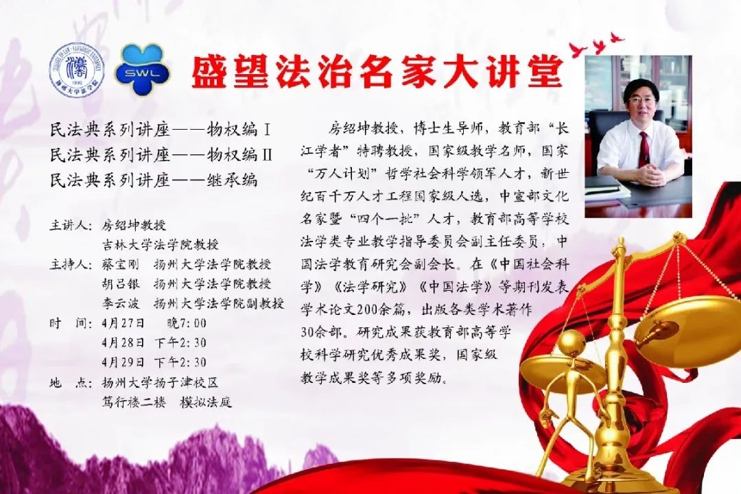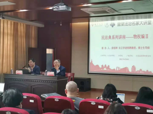 4月27-29日,学院新开设的“盛望法治名家大讲堂”正式启动。大讲堂旨在邀请著名学者作系列报告,不断深化对法学重大前沿问题的研究。博士生导师、国家级教学名师房绍坤教授莅临学院开设《民法典》系列讲座,讲座涉及物权编和继承编,共分为三场,分别由法学院院长蔡宝刚教授、胡吕银教授、副院长李云波主持,盛望律师事务所部分律师以及法学院、广陵学院部分师生代表600余人参加了本次名家讲堂。