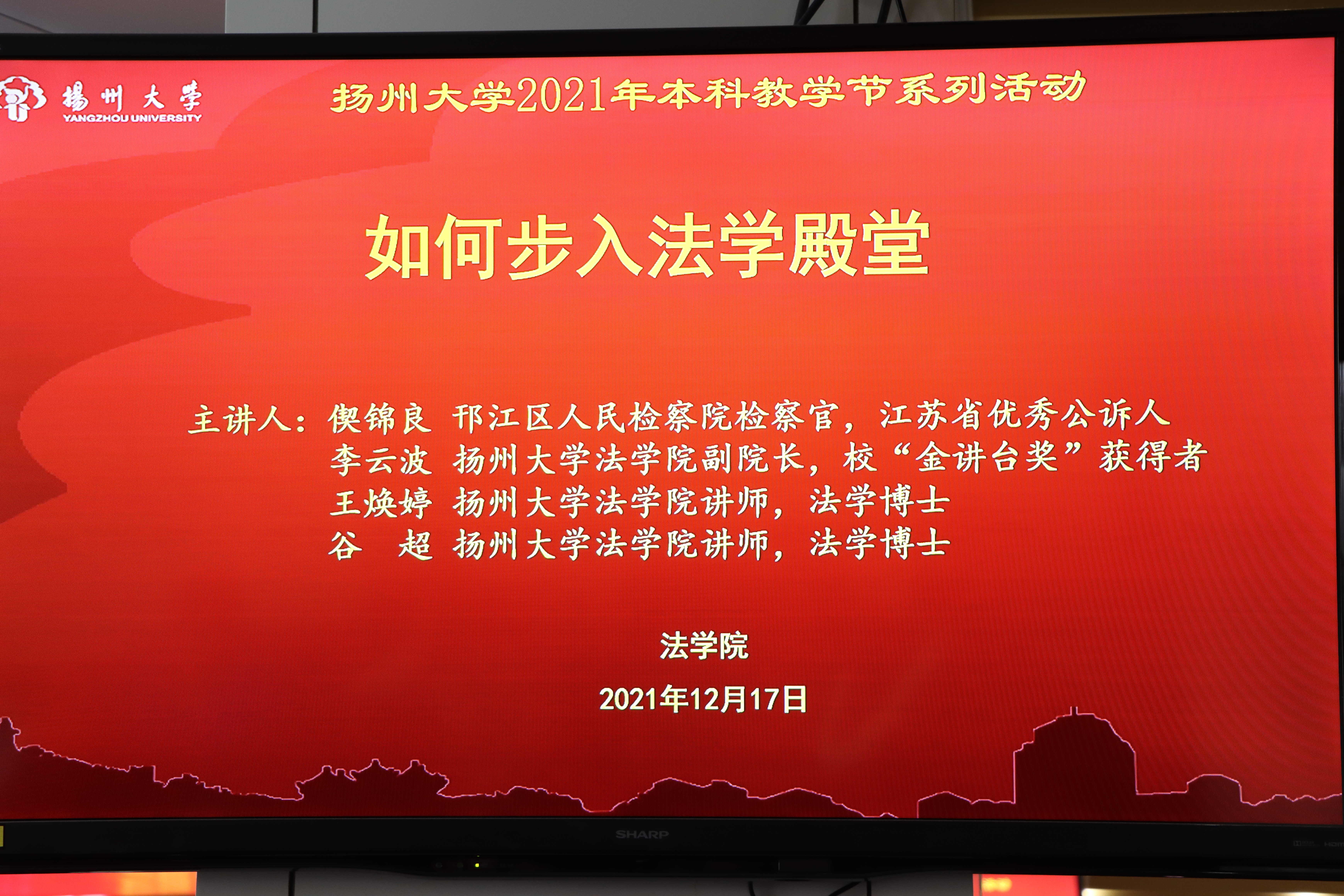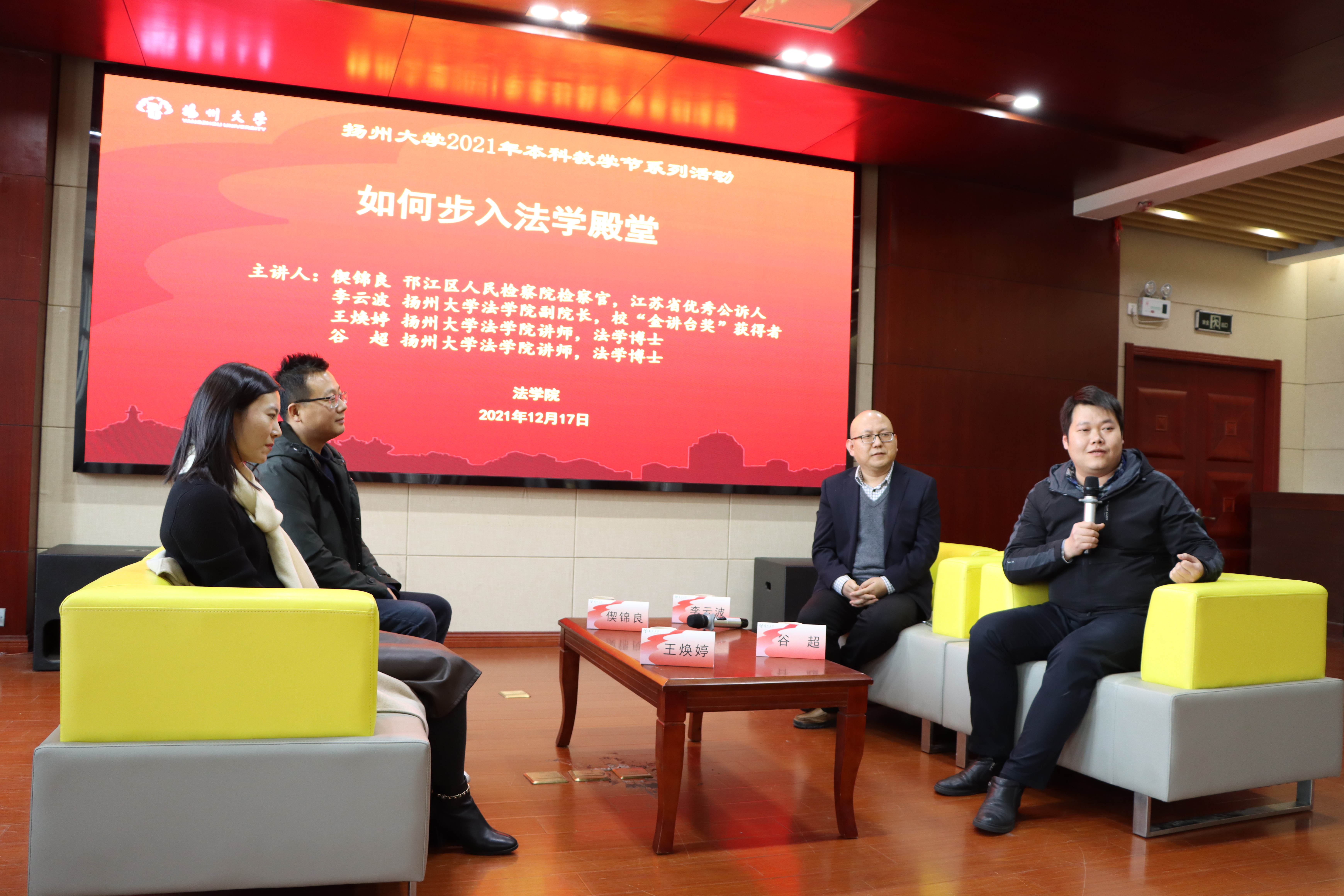2021年12月17日下午2点,法学院2021年本科教学节系列活动——“如何步入法学殿堂”主题活动在笃行楼二楼模拟法庭举办。活动邀请了邗江区人民检察院检察官、江苏省优秀公诉人偰锦良老师,扬州大学法学院副院长、校“金讲台奖”获得者李云波老师,扬州大学法学院讲师、法学博士王焕婷老师,谷超老师。董子铖同学担任主持人。