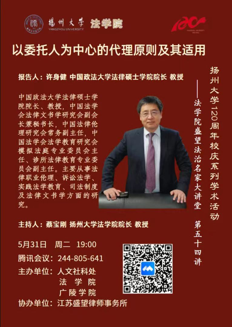 5月31日晚,中国政法大学法律硕士学院院长许身健教授应邀为我院师生作了题为“以委托人为中心的代理原则及其适用”的学术讲座。讲座由扬州大学法学院院长蔡宝刚教授主持,法学院李秀华教授参与与谈。法学院、广陵学院师生以及江苏盛望律师事务所青年律师线上参与聆听。
