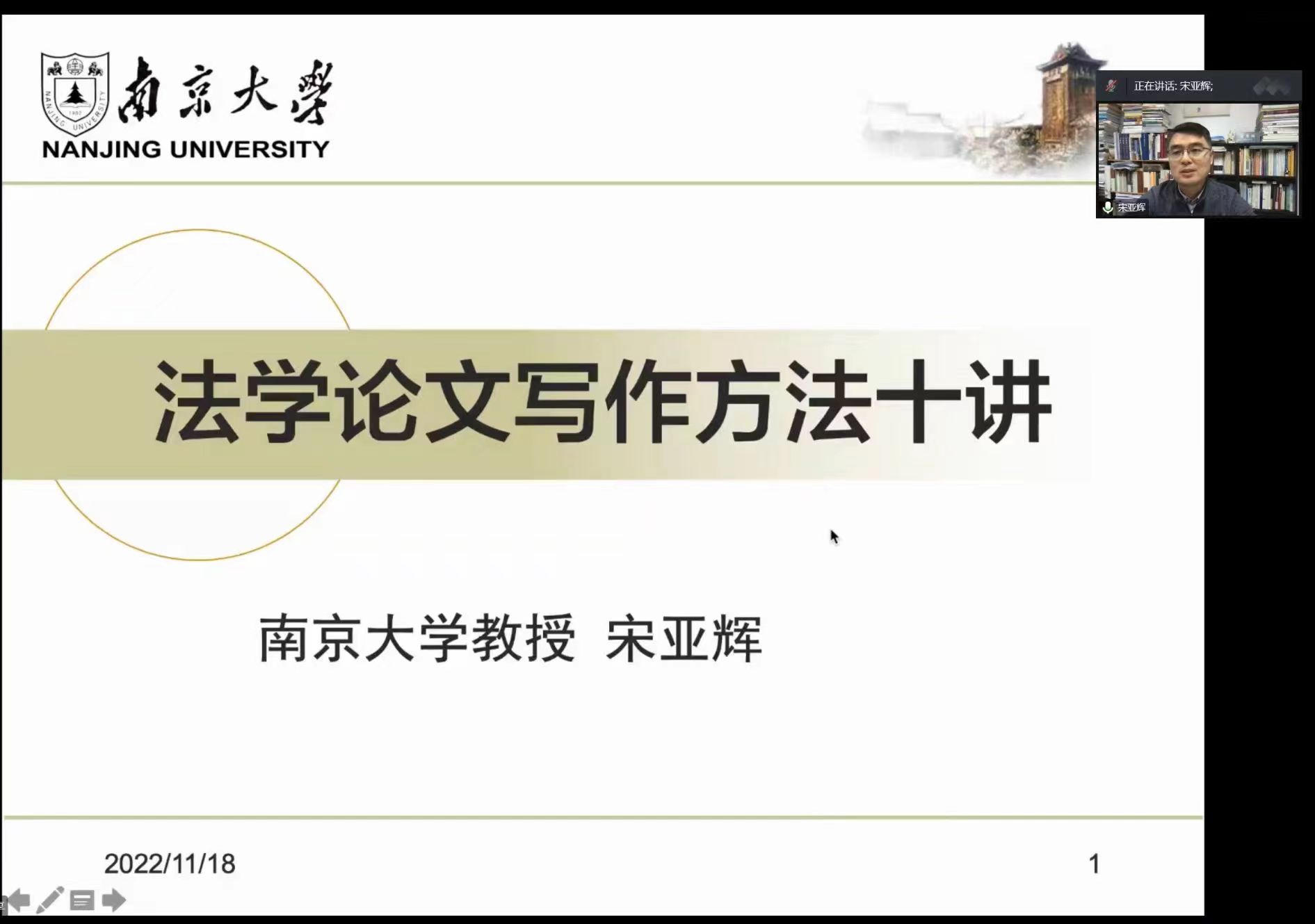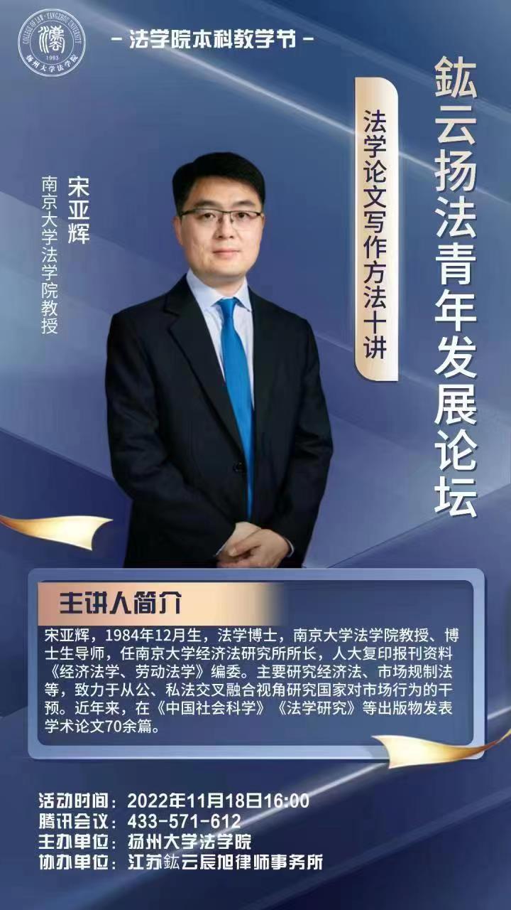 11月18日,南京大学法学院教授、南京大学经济法研究所所长、人大复印报刊资料《经济法学、劳动法学》编委、博士生导师宋亚辉教授,在线为我院师生作题为“法学论文写作方法十讲”的学术报告。本次讲座为鋐云扬法青年发展论坛讲座,由扬州大学法学院曲昇霞副院长(主持工作)主持,高永明副院长、郑天祥博士、法学院研究生以及江苏鋐云辰旭律师事务所律师共150多人在线聆听了报告。