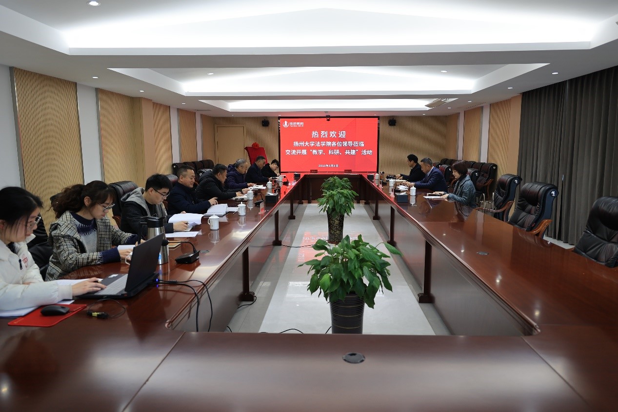 吕国兵对学院一行表示欢迎,并就扬建集团的发展历史、业务分布、所获荣誉以及与我校的合作情况进行了介绍,表达了未来与法学院在人才培养以及科学研究方面深化合作的愿景;卫喜亮介绍了扬建集团人才招聘信息,并希望更多法学院毕业生能够进入扬建集团工作;张升华介绍了扬建集团法务部的基本情况以及近年来取得的主要业绩和工作特色。