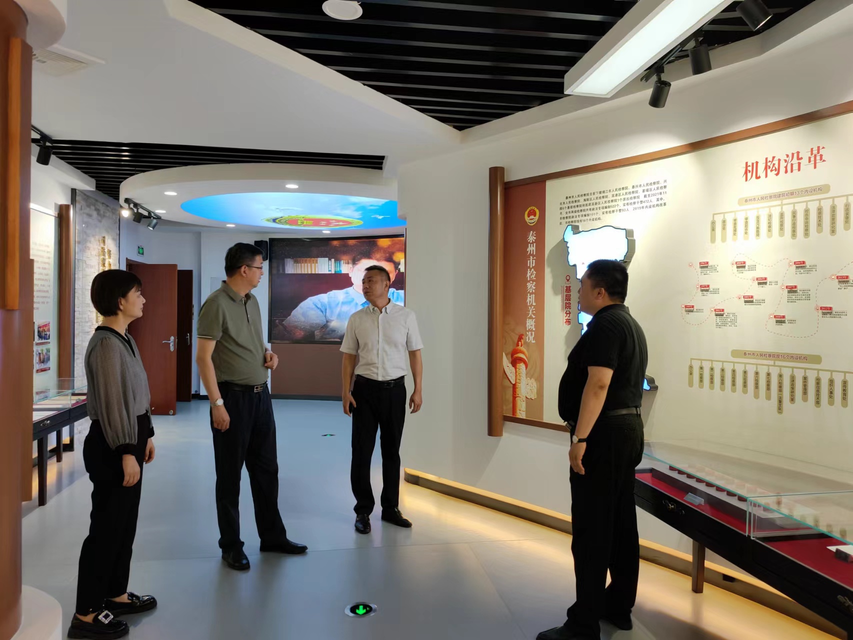 江苏省泰州市人民检察院党组成员、政治部主任,我院94级校友申玉军热情接待了花书记一行。他对母校领导、老师的到来表示诚挚的欢迎,并陪同参观了泰州市人民检察院检察史馆、检悦书房和泰州检察普法中心。申玉军主任详细介绍了泰州市人民检察院的发展沿革、职能机构、人才招聘和产学研需求等。花瑞锋书记代表学院表示感谢,对法学院的办学特色、学科建设、实习实训基地建设等情况做了介绍,希望今后能够在人才培养、产学研深度融合、见习实习等方面和泰州市人民检察院开展深入交流合作。