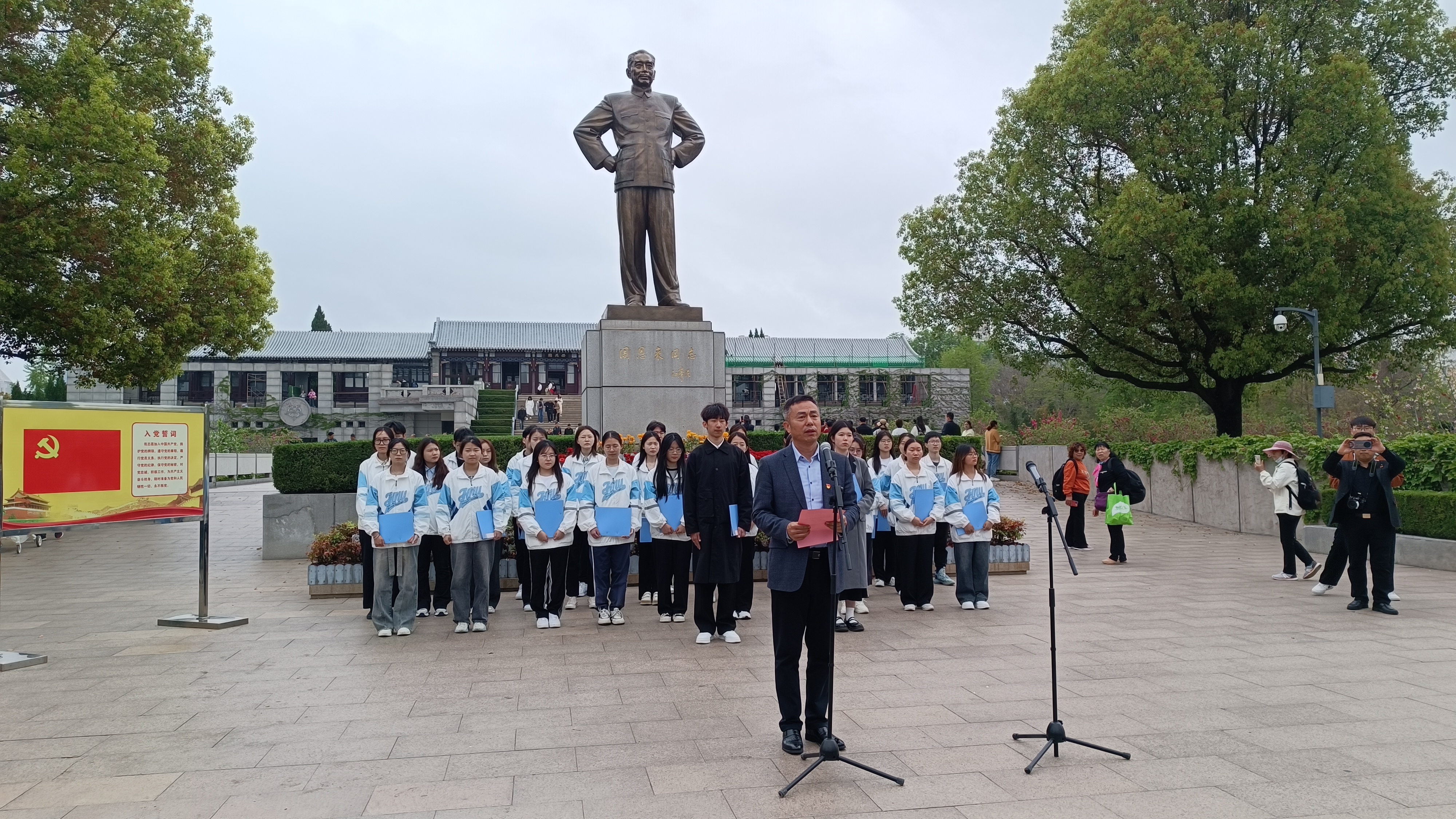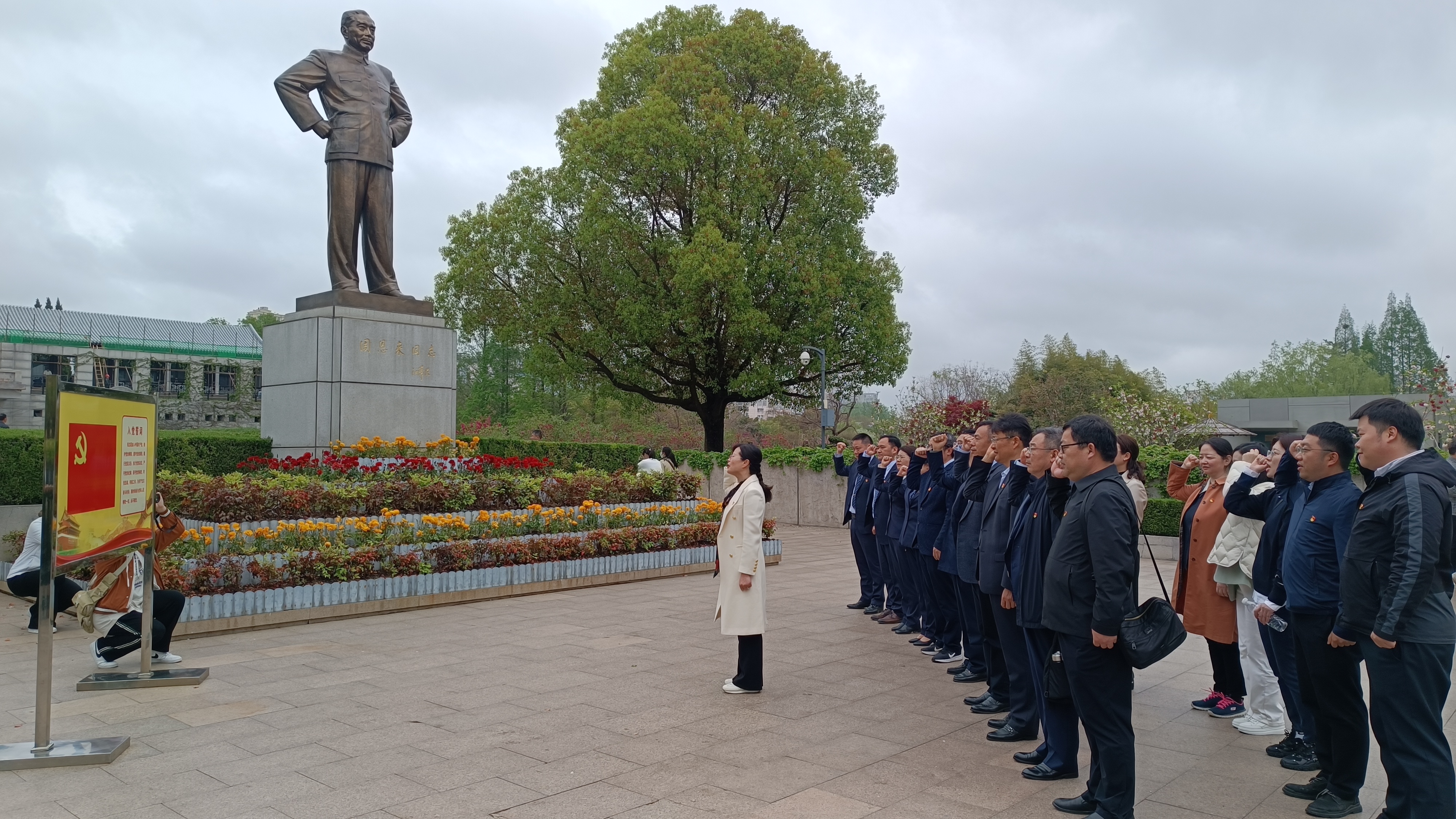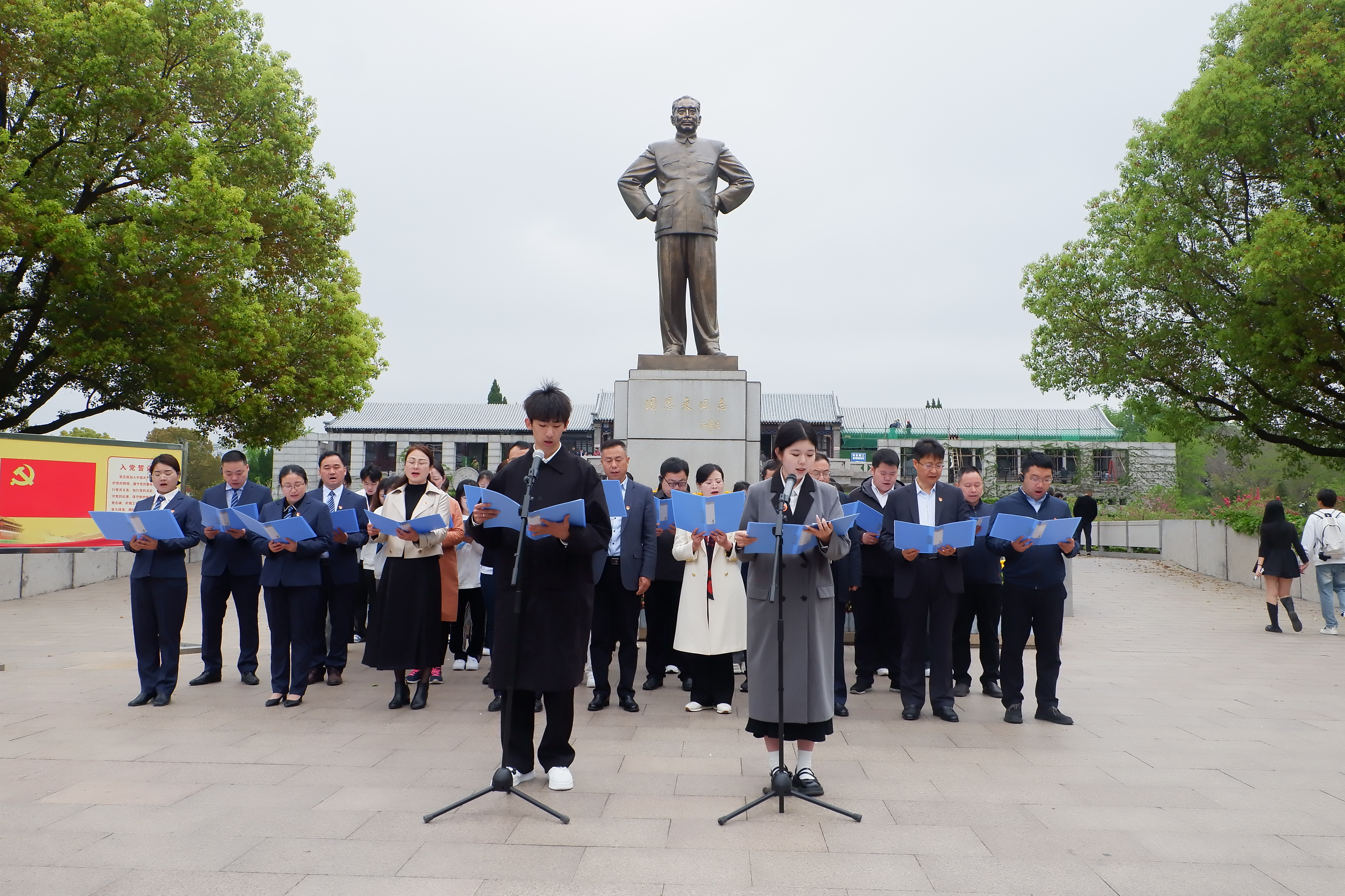 在周恩来总理铜像广场,全体党员与学生代表深情朗诵诗歌《西花厅的那盏灯》。花瑞锋书记为全体党员带来一场别开生面的“微党课”,他强调作为新时代的法律人,要以周恩来总理为榜样,传承伟人精神,践行初心使命,为推动中国特色社会主义事业的高质量发展贡献力量。随后,全体党员重温入党誓词,宣誓将继续不忘初心,砥砺前行。