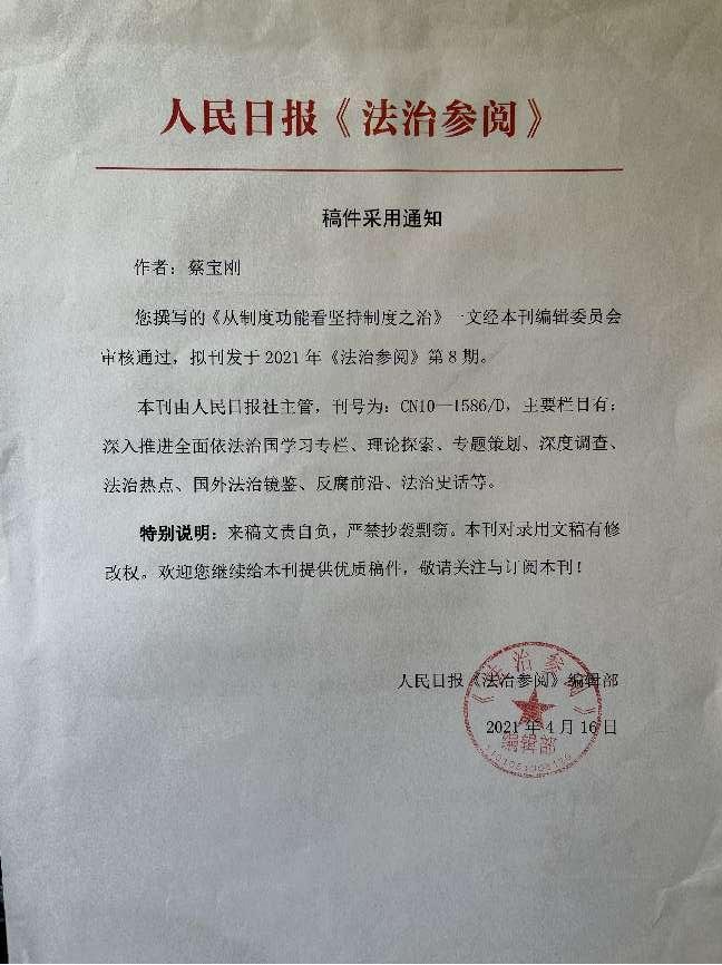 人民日报《法治参阅》第8期刊登我院蔡宝刚教授《从制度功能看坚持制度之治理》一文