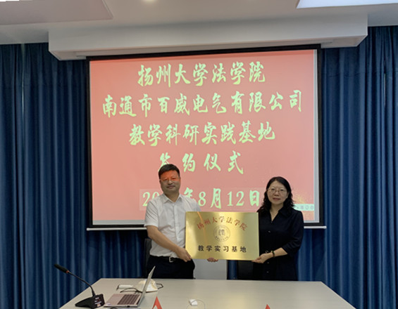 在南通市百威电气有限公司,公司总经理,我院2000级法学一班校友童爱华陪同花瑞锋一行实地参观了公司的文化长廊、生产车间等场所,深入了解企业生产运营、产品研发及用人需求等情况。随后,花瑞锋一行与公司负责同志进行了座谈交流。童爱华介绍了公司基本发展及用人政策情况,分享了自己求学经历、职业选择、工作经验,对母院的培养表示感谢。曲昇霞院长就学院发展情况做了介绍,对校友们长期对学院的关注和支持表示感谢。双方就人才培养、专业建设、岗位薪资等方面进行了深入交流研讨。副院长高永明代表学院与百威公司签订了教学科研实践基地共建协议,副院长(主持工作)曲昇霞和公司总经理童爱华共同为基地揭牌。