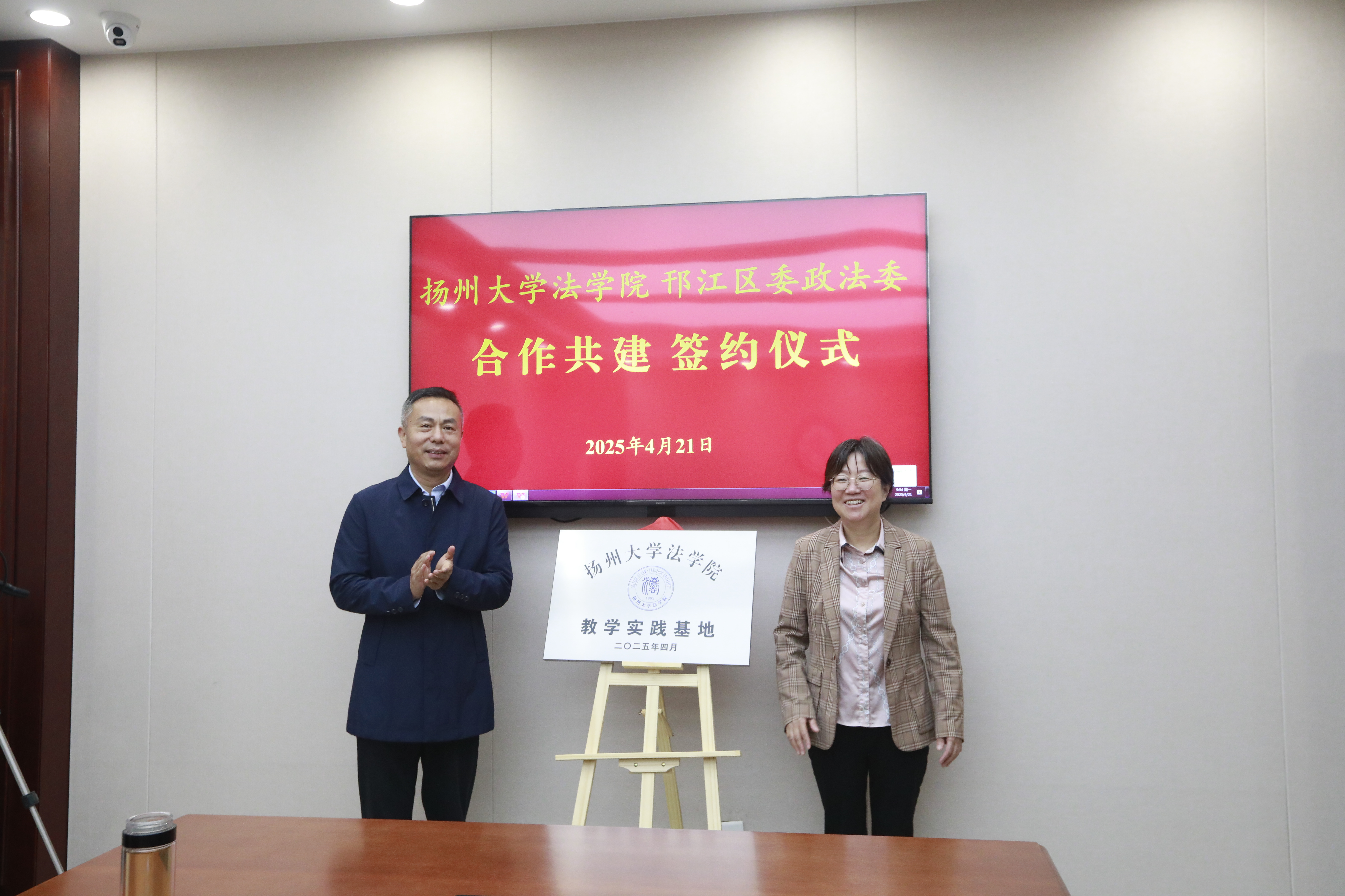 为深化校地合作、共育法治人才,4月21日上午,学院与邗江区委政法委举行合作共建签约暨实训实践基地揭牌仪式。法学院党委书记花瑞锋,邗江区委常委、政法委书记贺宝兰出席活动并致辞,双方共同为“江苏调解学院调解实训基地”与“扬州大学法学院教学实践基地”揭牌,副院长高永明、副书记李蕴哲等出席签约仪式。