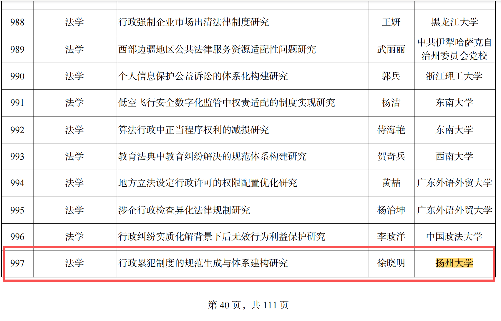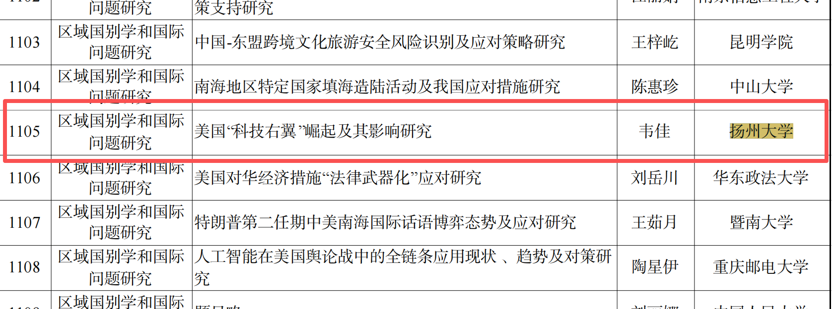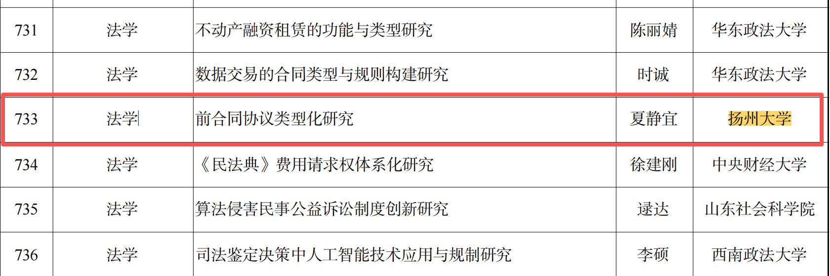近日,全国哲学社会科学工作办公室发布了《关于2025年国家社会科学基金年度项目立项名单的公示》。徐晓明教授《行政累犯制度的规范生成与体系建构研究》获一般项目立项公示;夏静宜副教授《前合同协议类型化研究》、韦佳老师《美国“科技右翼”崛起及其影响研究》分获青年项目立项公示。