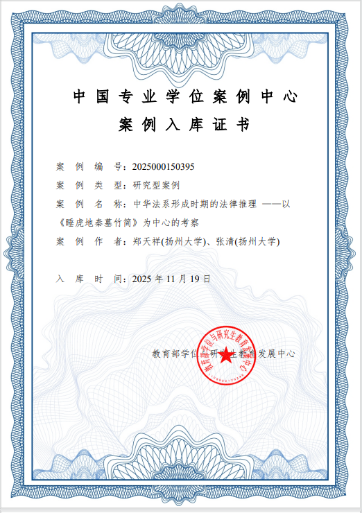 近日,教育部学位与研究生教育发展中心发布了《关于2023年度主题案例结项结果的通知》,我院张清教授主持的主题案例项目《中华法系形成时期的法律概念逻辑—以<睡虎地秦墓竹简>为研究对象》、郑天祥博士主持的《中华法系形成时期的法律推理——以<睡虎地秦墓竹简>为中心的考察》顺利通过结项审核,并作为优秀案例成果正式收录在中国专业学位案例中心。