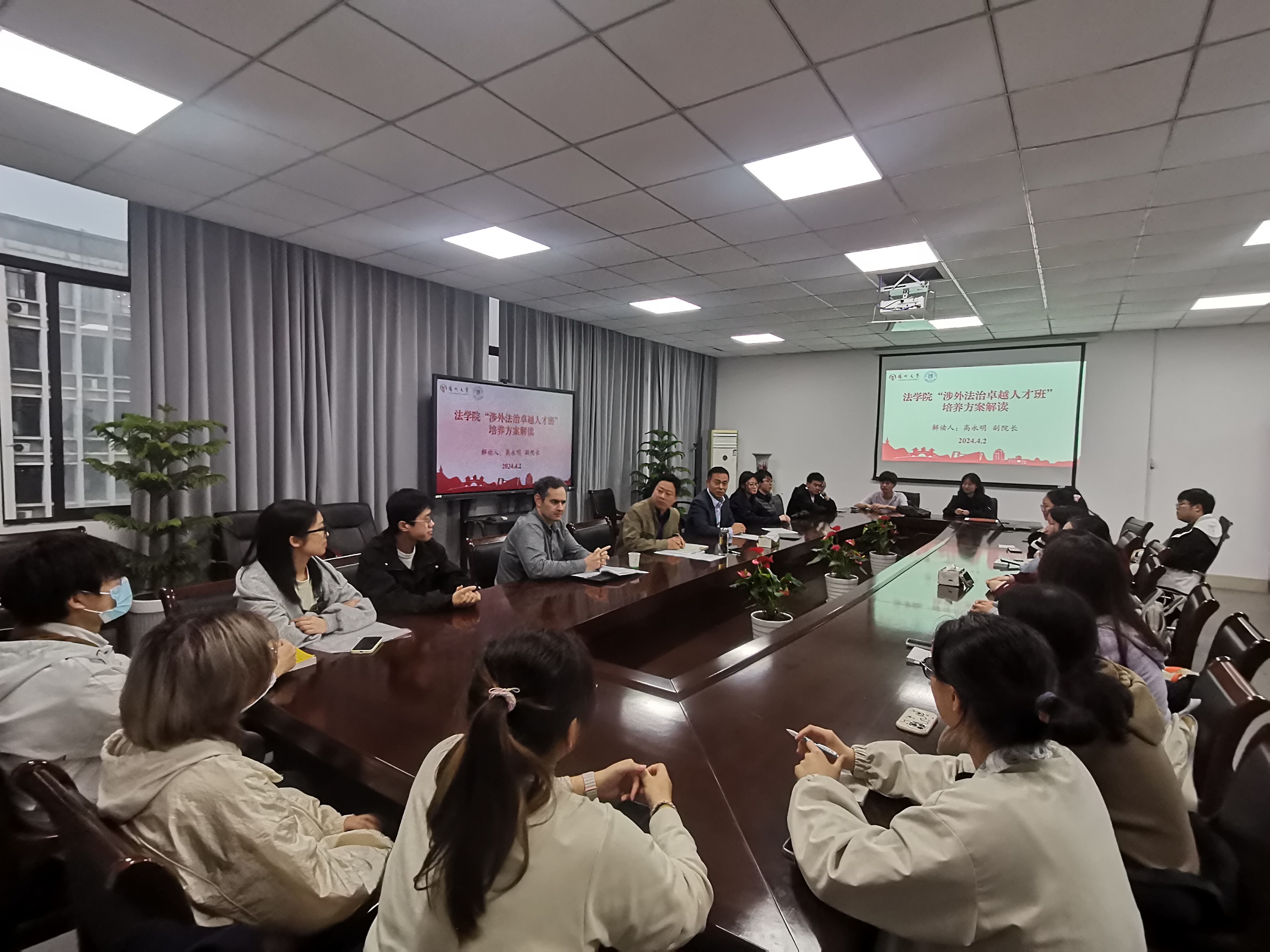 4月2日,学院第一届“涉外法治人才卓越班”召开培养方案解读会,党委书记花瑞锋、副院长高永明、班主任福斯凯参加本次活动。
