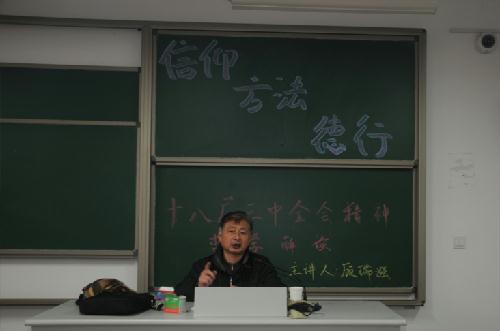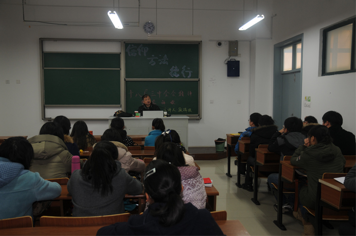为进一步加强学生对十八届三中全会精神的理解,12月18日下午我院本科1302班特邀院关工委顾瑞漒老师为大家进行解读。顾老师主要从“信仰”、“方法”、“德行”三个方面进行了分析,他深入浅出,旁征博引,为大家介绍了中国最近取得的令人瞩目的成就,分析了在目前的国际国内最新形势下中国所采取的的应对措施。最后,他指出当代大学生要做一个有信仰、有德行的人,在学习的过程中不仅要掌握知识,更要掌握方法,最终要实现物的不断丰富和人的全面发展的统一。