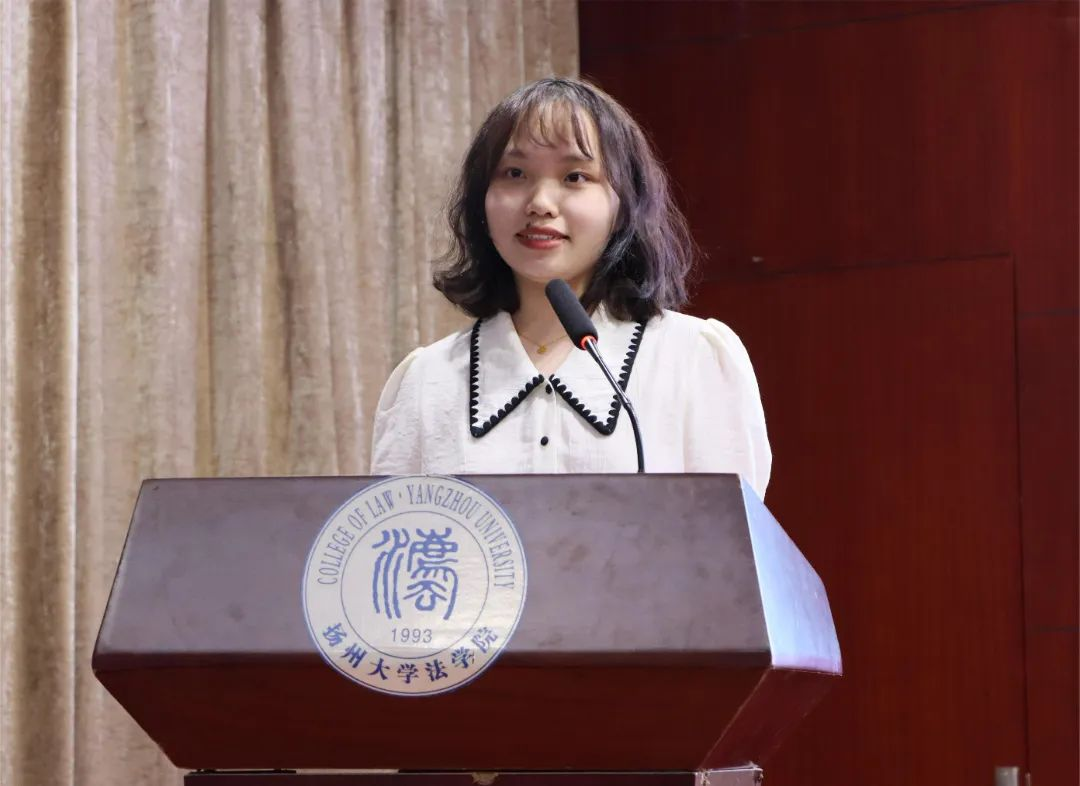 她表达了对成为扬大法学院一员的荣幸以及对未来的美好憧憬,她表示未来将坚守初心,牢记使命,以奋斗的姿态在青春的赛道上奋力奔跑,争取跑出当代青年的最好成绩。