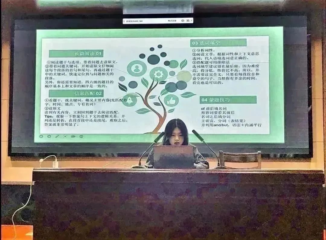 谢雨欣同学则详尽地分享了个人备考方案,包括时间分配、做题顺序、答题技巧等,独特的技巧和丰富的题型分析为即将面临四级考试的新生们提供了很大助益。具体精确的考试模块解析与多样化的应考准备形式带给同学们的不仅是震撼,更激起了满满的斗志。最后,她祝愿同学们都能一次通过四级考试,取得满意成绩。
