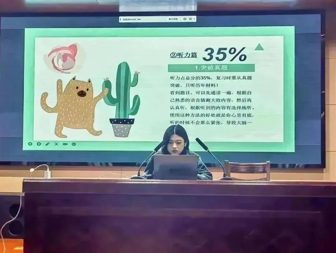 陆馨怡同学开门见山,以“只争朝夕,不负韶华”为引,从“考前准备”“答题技巧”“复习方法”三个方面对英语四级考试进行了解读,通过表格形式详细地列出了英语四级的考试流程安排以及题型分值分配,讲解细致到位,内容包括每个题型的特点、难易程度和应对策略。她细心地提醒同学们尽量在考试前一天保证健康饮食和睡眠质量,鼓励同学们树立起良好的应考心态,以饱满的状态应对考试。