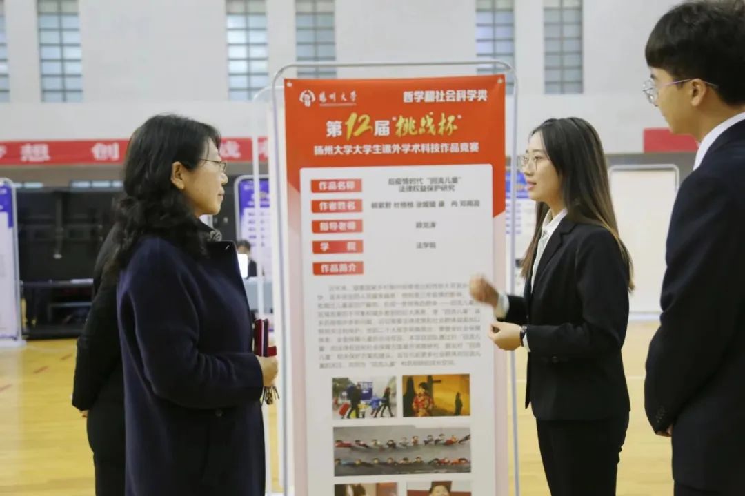 与此同时,扬子津校区文津楼各答辩教室内,各个团队的终审答辩正如火如荼地进行。本次扬州大学大学生课外学术科技作品竞赛终审决赛,法学院的“探寻平安法治乡村建设的‘沿湖经验’”和“后疫情时代‘回流儿童’法律权益保护研究”两个团队将就前期研究成果进行答辩。