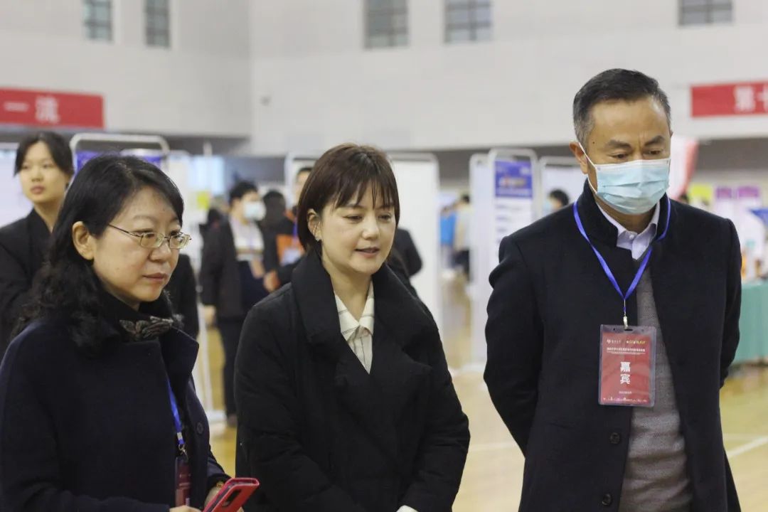评审嘉宾在展板前驻足,对同学们立足专业,勇于创新的精神表示肯定,并在听完项目负责人的介绍后给出了点评意见和专业性指导。