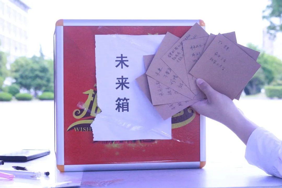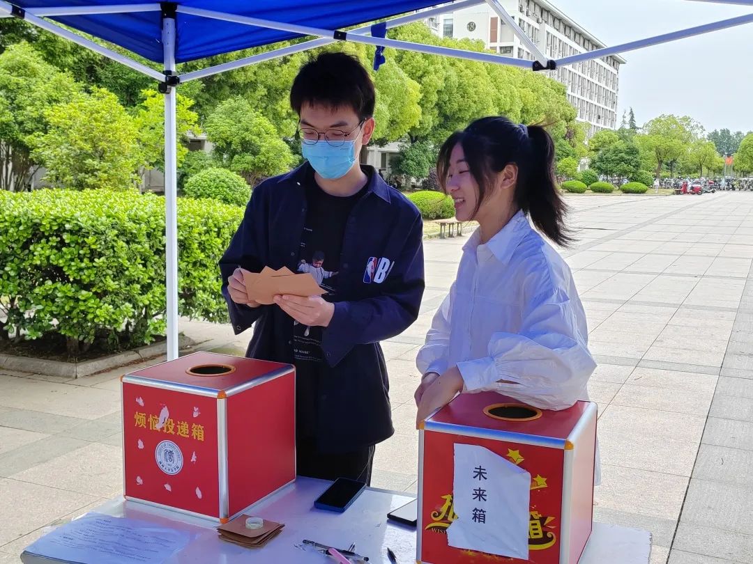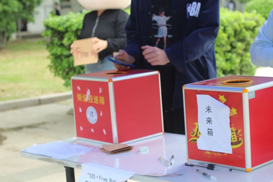 第一个活动是“告别过去,对话未来”,同学们将想对过去的自己说的话写在一张信上,丢进承载着过去的遗憾、内疚、内耗等消极情绪的“过去箱”,和过去的自己勇敢告别;同时把想对未来的自己说的话写在另一张信上,投进承载着未来的希望、快乐、积极等积极情绪的“未来箱”,祝福那个未来更好的自己。在此活动中,同学们释放了压力,感受到了久违的轻松。