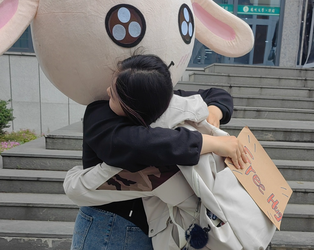 第二个活动是“爱的抱抱,传递爱与希望”,当穿着玩偶服的志愿者与同学们进行拥抱时,有人喜笑颜开,有人默默流泪,但不同情绪凝聚而成的,都是对这满含爱与希望的拥抱的感谢,大家在简单平凡的拥抱中收获到了爱意。