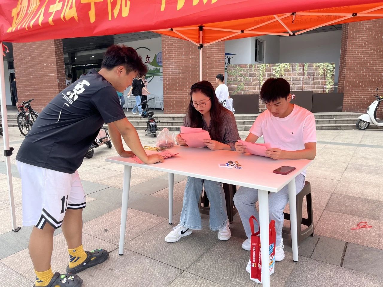 本次活动摆放了公益法律咨询的展位,在团委顾泽楠老师的指导下,法学院硕士研究生邵嫄嫄、郭栋作为咨询志愿者参加了现场活动,以法律人的视角解读扬大同学们所遇到的问题,并为其提供专业的法律咨询。他们还通过民法典结合小案例的形式进行普法宣传,将法条与生活情境相结合,耐心讲解法律知识,现场咨询的同学络绎不绝。