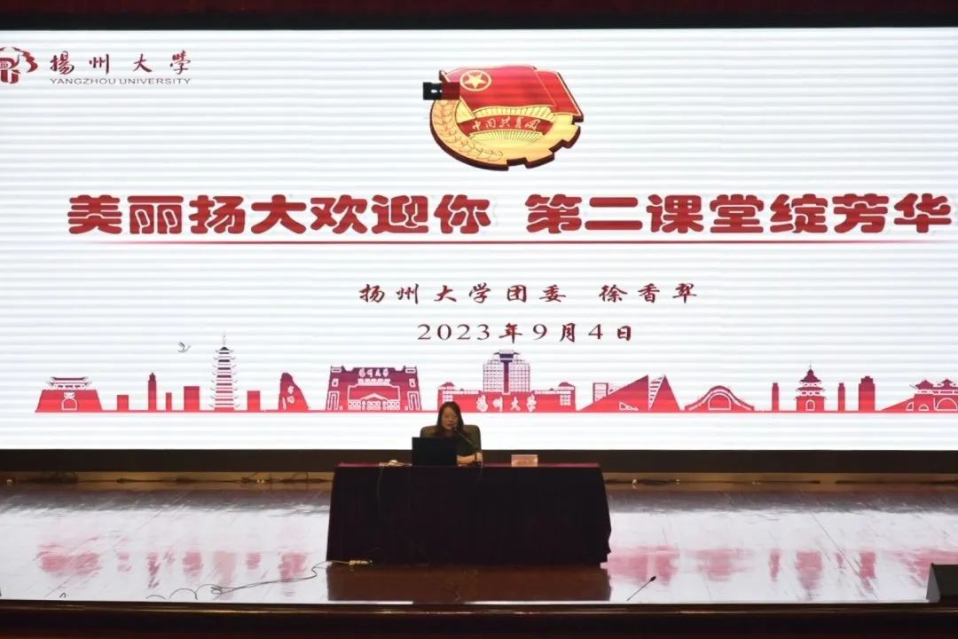 2023年9月4日晚6:30,我院在扬子津文体馆三楼报告厅举办扬州大学法学院2023级新生入学教育活动——美丽扬大欢迎你,第二课堂绽芳华。全体2023级新生参加本次活动,本次教育活动由校团委副书记徐香翠老师主讲。