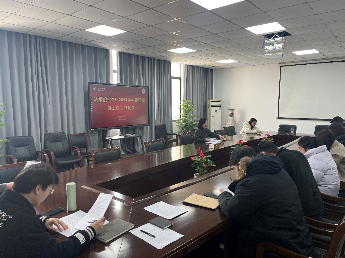 为确保新学期教育教学工作的有序开展,进一步增强班级管理工作的针对性和实效性,3月7日下午,扬州大学法学院在扬子津校区笃行楼313会议室顺利召开2024年春季新学期班主任工作会议,院党委副书记李蕴哲、全体班主任老师及全体辅导员参与了此次会议。