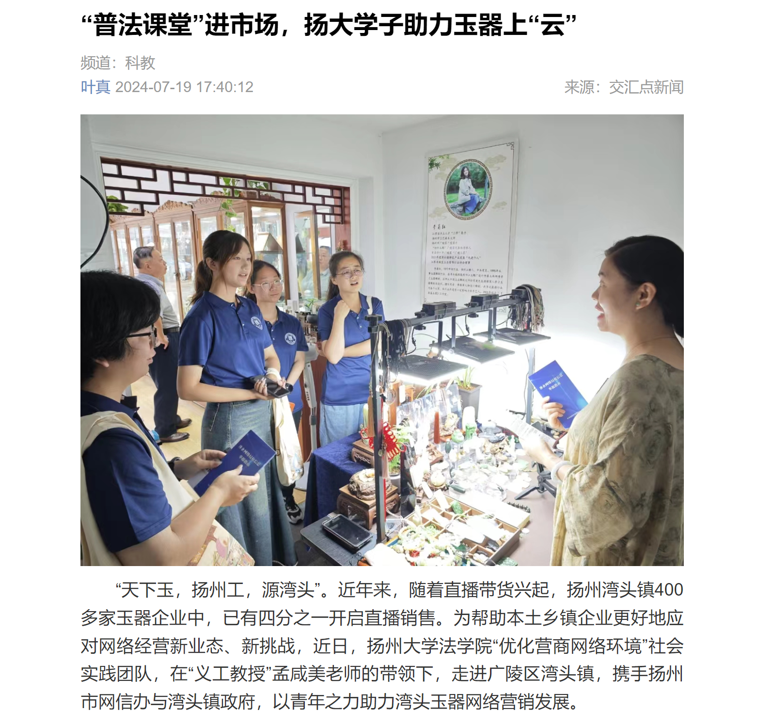 近日,我院“优化营商网络环境”实践团队,在“义工教授”孟咸美老师的带领下,携手扬州网信办与湾头镇政府,助力广陵区湾头镇玉器网络营销发展,获得“交汇点新闻”报道。