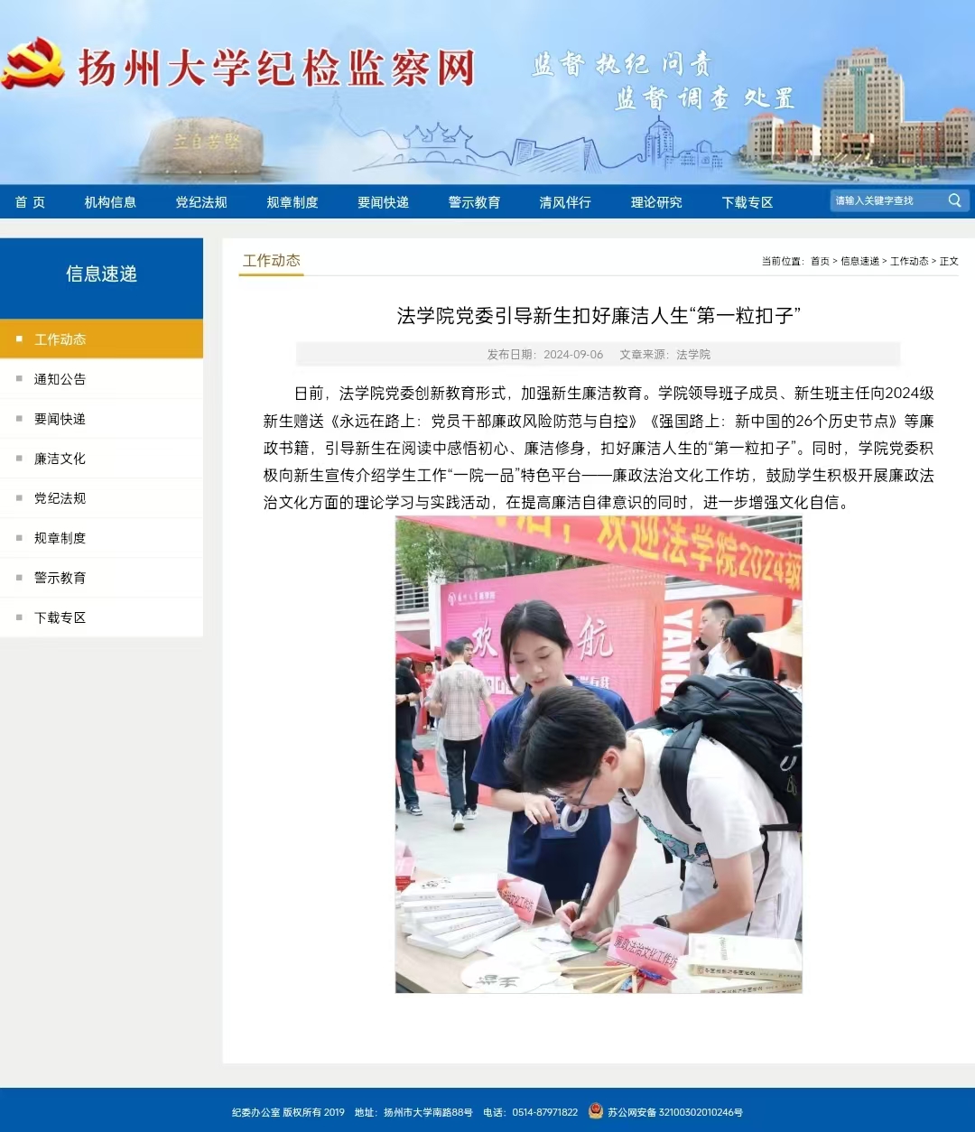 近日,我院党委创新教育形式,加强新生廉洁教育,向新生赠送相关廉洁书籍、介绍“一院一品”特色平台——廉政法治文化工作坊,帮助新生扣好廉洁人生的“第一粒扣子”。