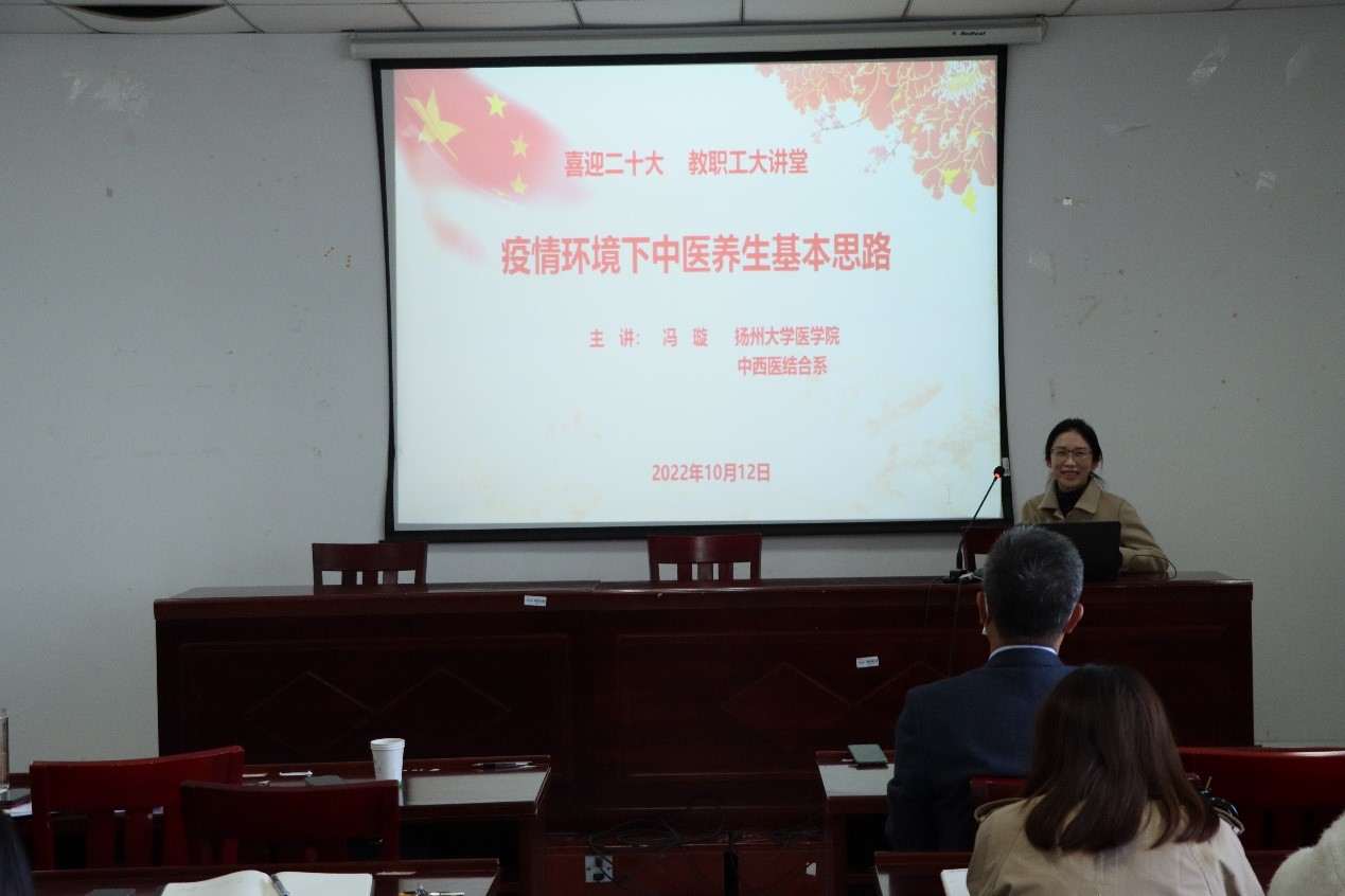 10月12日下午,学院工会举办“喜迎二十大”职工大讲堂,扬州大学医学院中西医结合系副教授冯璇博士作了疫情环境下中医养生基本思路的讲座,学院全体教职工参加了活动。