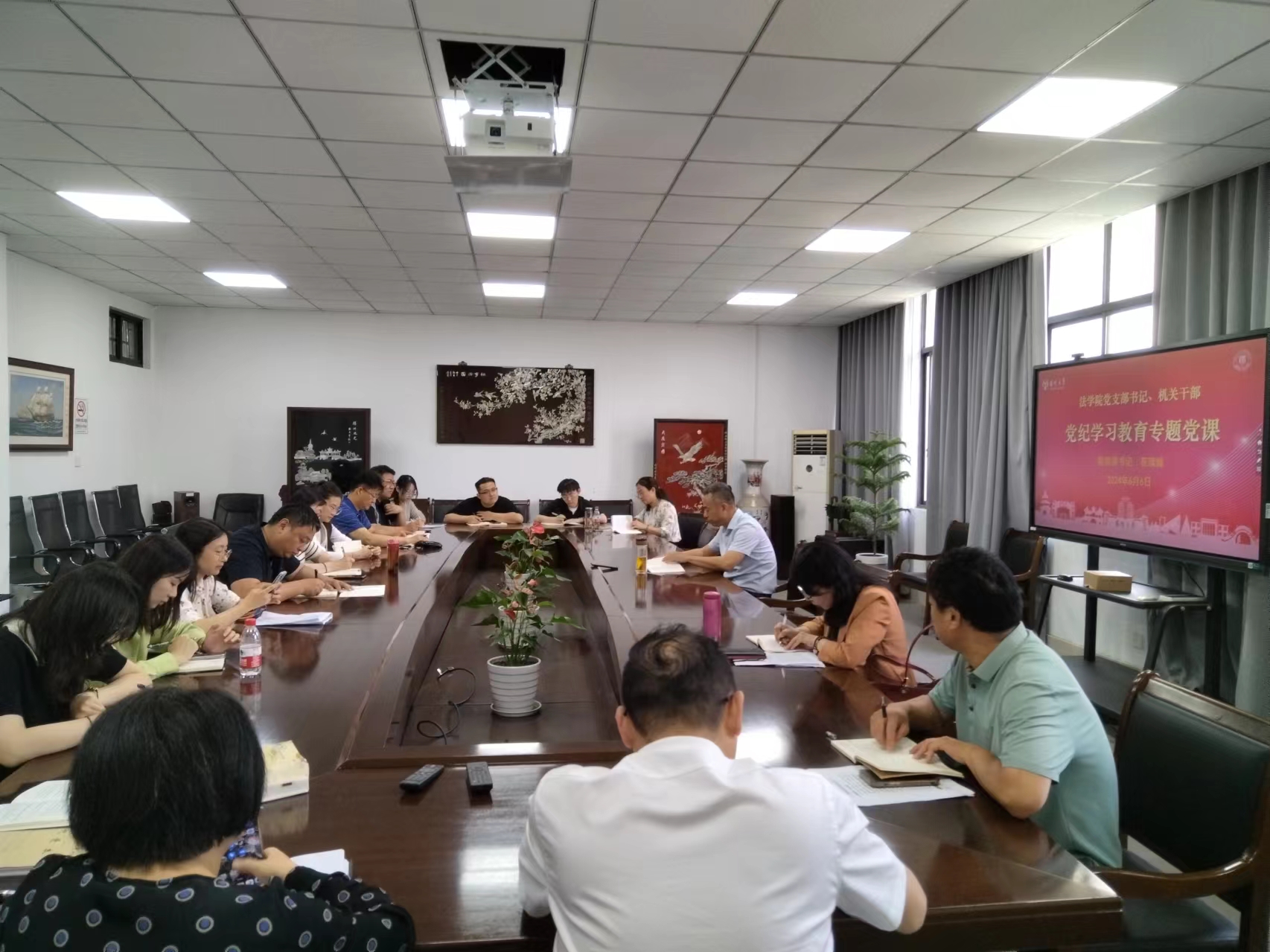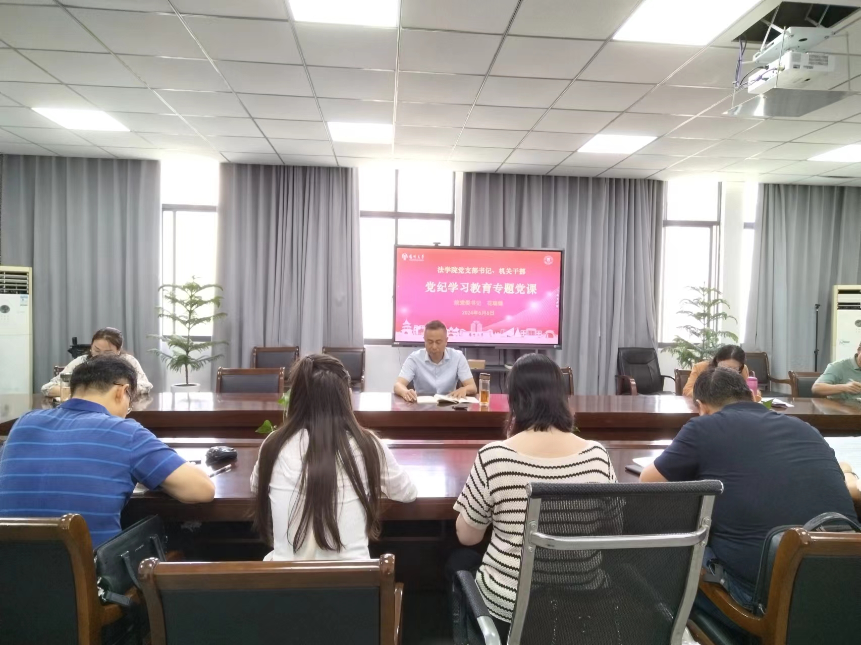 为全面贯彻落实习近平总书记关于全面从严治党的重要论述和关于党的自我革命的重要思想精神,深入推进全院党风廉政建设,增强全体党员干部拒腐防变能力。6月6日,院党委书记花瑞锋同志在法学院会议室讲了一堂党纪学习教育专题党课。学院理论中心组全体成员、各党支部书记、各部门负责人及工作人员参加了学习。